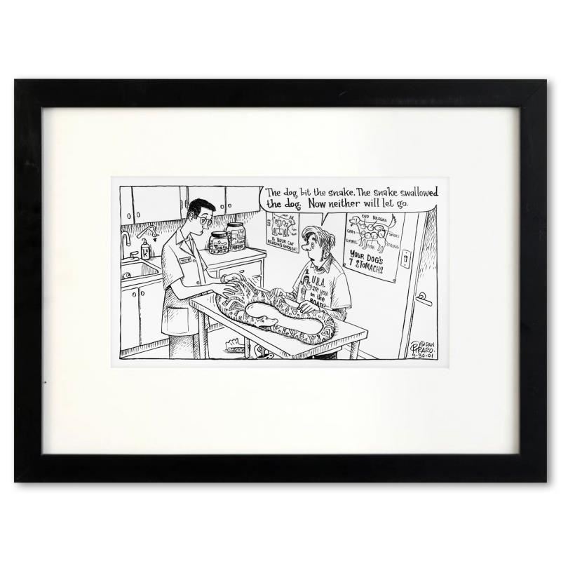 Enter a surreal and satirical world of twisted imagination and award winning creativity. "Stubborn Pets" is an original pen & ink drawing on paper by Dan Piraro, creator of the critically acclaimed and award winning comic strip, Bizarro. This piece is hand signed, comes custom framed and includes a letter of authenticity. Measures approximately 14" x 21" (frame), 7" x 13" (image).This item requires special handling and may have a longer than usual turnaround.