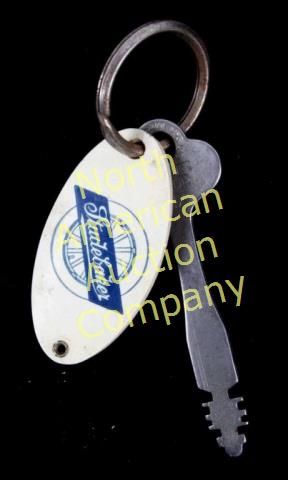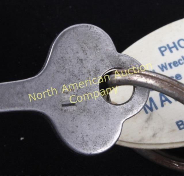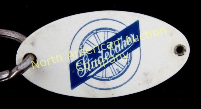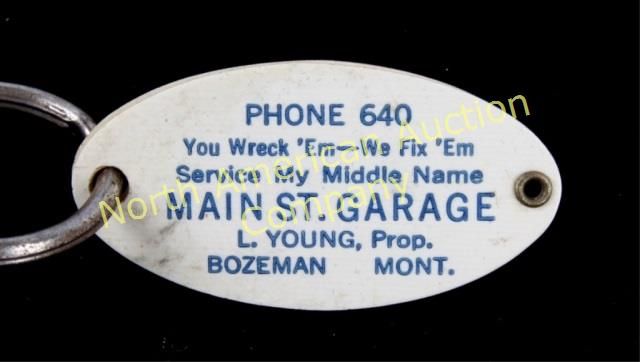 This is an original celluiod Studebaker Key chain advertising from Bozeman, Montana. The back reads, "Phone 640 You Wreck 'Em - We Fix 'Em Service My Middle Name Main St. Garage L. Young, Prop. Bozeman Mont." Rare piece.