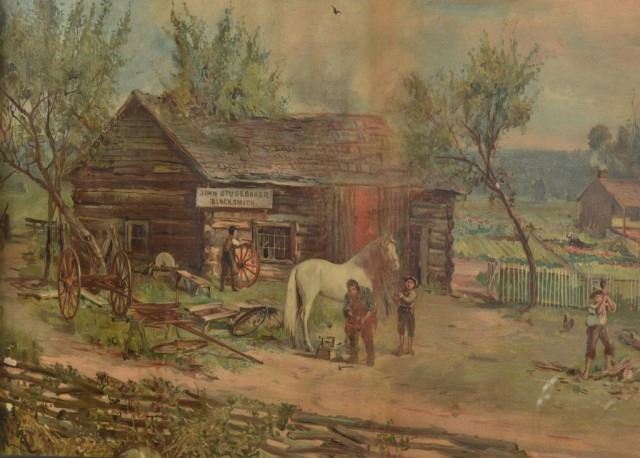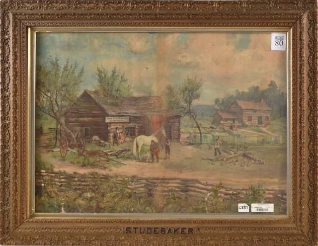 28.5" x 37.25" early Studebaker Wagons advertising lithograph in Studebaker frame.