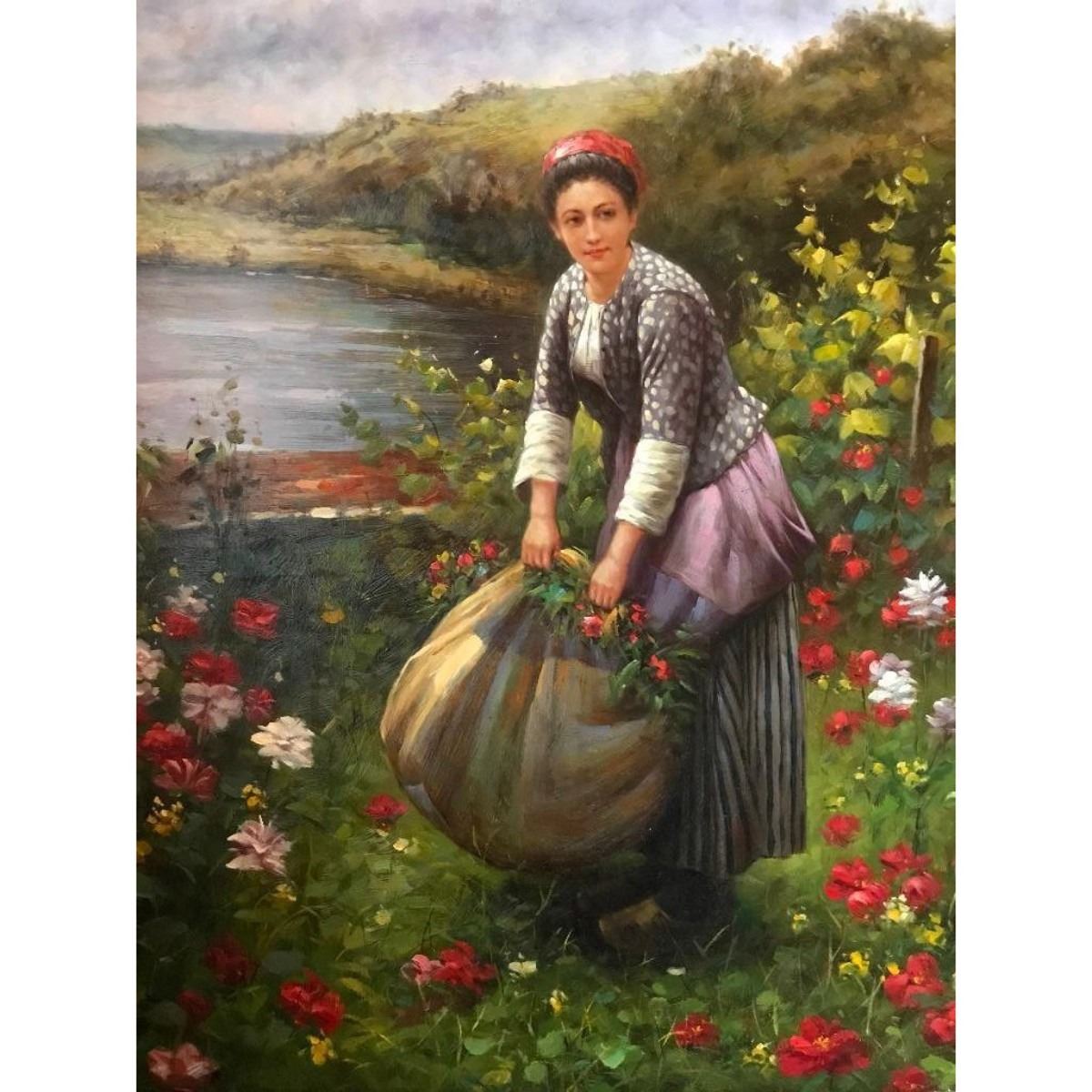 Student of Daniel Ridgeway Knight ( American, 1839 - 1924) exacting replica of "The Grass Cutter", a beautiful peasant girl gathering flowers. Oil on board painting in ornate new Victorian style gold gilt over solid wood frame. Painting 20" X 24" Outer dimensions of frame 28" X 32".