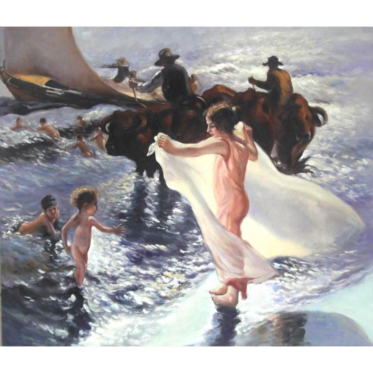 Student of George Lambert ( Australian 1873 - 1930 ) "Day at the Sea" oil on board painting. Twilight colors & subject matter similar to George, but without a signature. 20" X 24".
