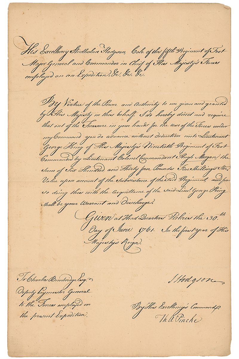 British commander (1708–1798) best rememberd for commanding the 1761 expedition that captured Bell Isle. Manuscript DS, signed “S. Hodgson,” one page, 8 x 12.5, June 30, 1761. British military warrant for subsistence pay. In part: “I do hereby direct and require that out of the Treasure in your hands for the use of the Forces under my Command you do advance without deduction unto Lieutenant George King of His Majesty's Ninetieth Regiment of Foot Commanded by Lieutenant Colonel Commandant Hugh Morgan, the Sum of Six Hundred and Thirty four Pounds Five Shillings Ster. Value upon account of the Subsistence of this said Regiment.” In very good condition, with small separations along intersecting folds, partial separation to hinge, and some light rippling and toning.