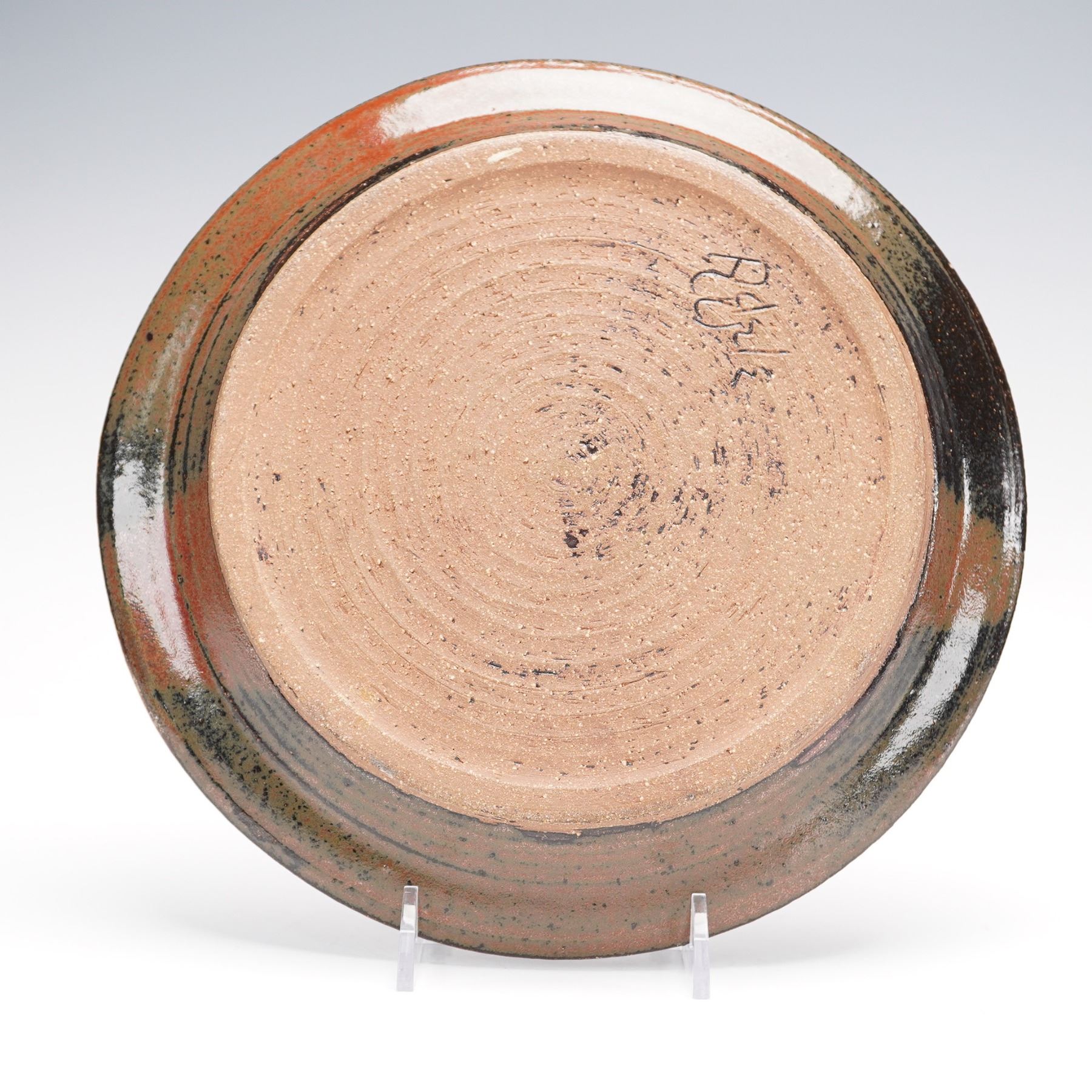 A dramatic hand-thrown ceramic charger featuring a deep rust-red and muted olive green glaze, with a sweeping band of creamy white that evokes a minimal abstract landscape. The concentric rings of the thrown form are accentuated by subtle speckling in the glaze, lending a richly textured surface. On the unglazed terracotta base the artist's signature is incised, suggesting a one-of-a-kind studio piece. Measures 8.75"dia.