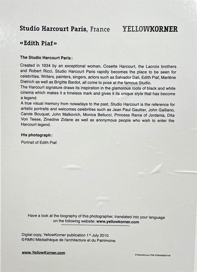 Studio Harcourt Paris France Edith Piaf French singer, actress YellowKorner Certified Photograph. Certificate of Authenticity from YellowKorner affixed to the back. Matted Dimensions 16"x20". Protected with Clear Mylar Sleeve.