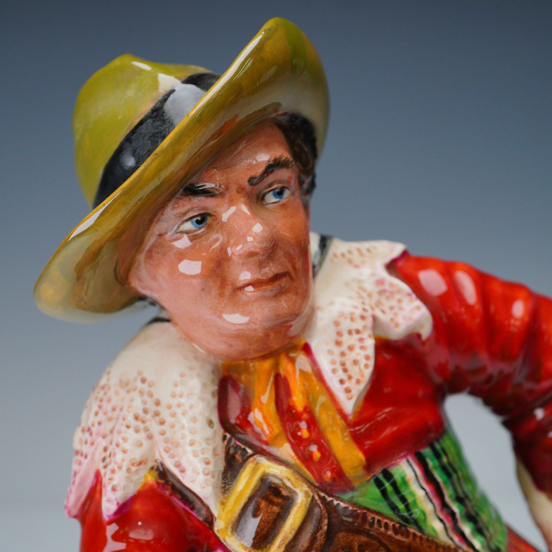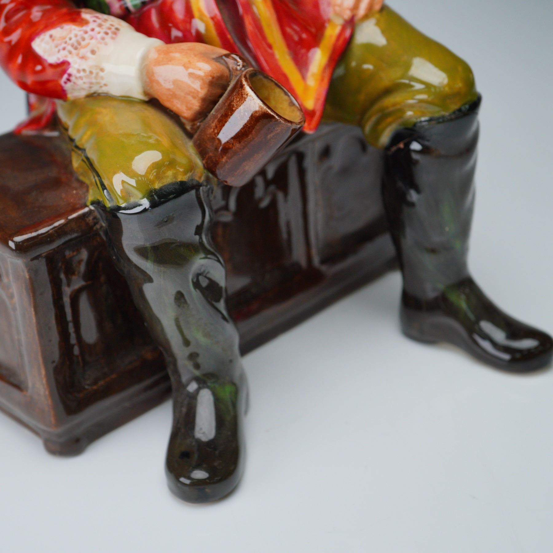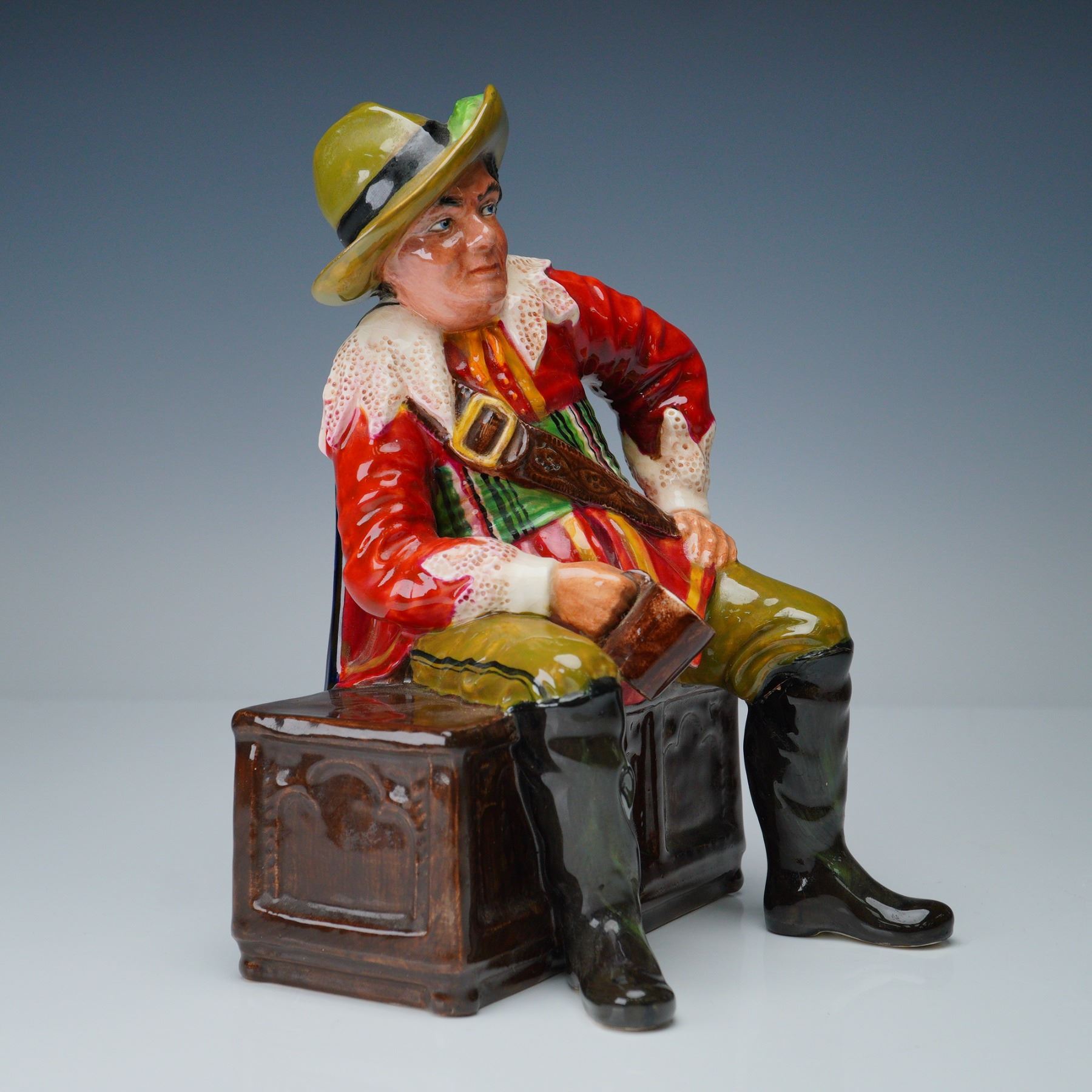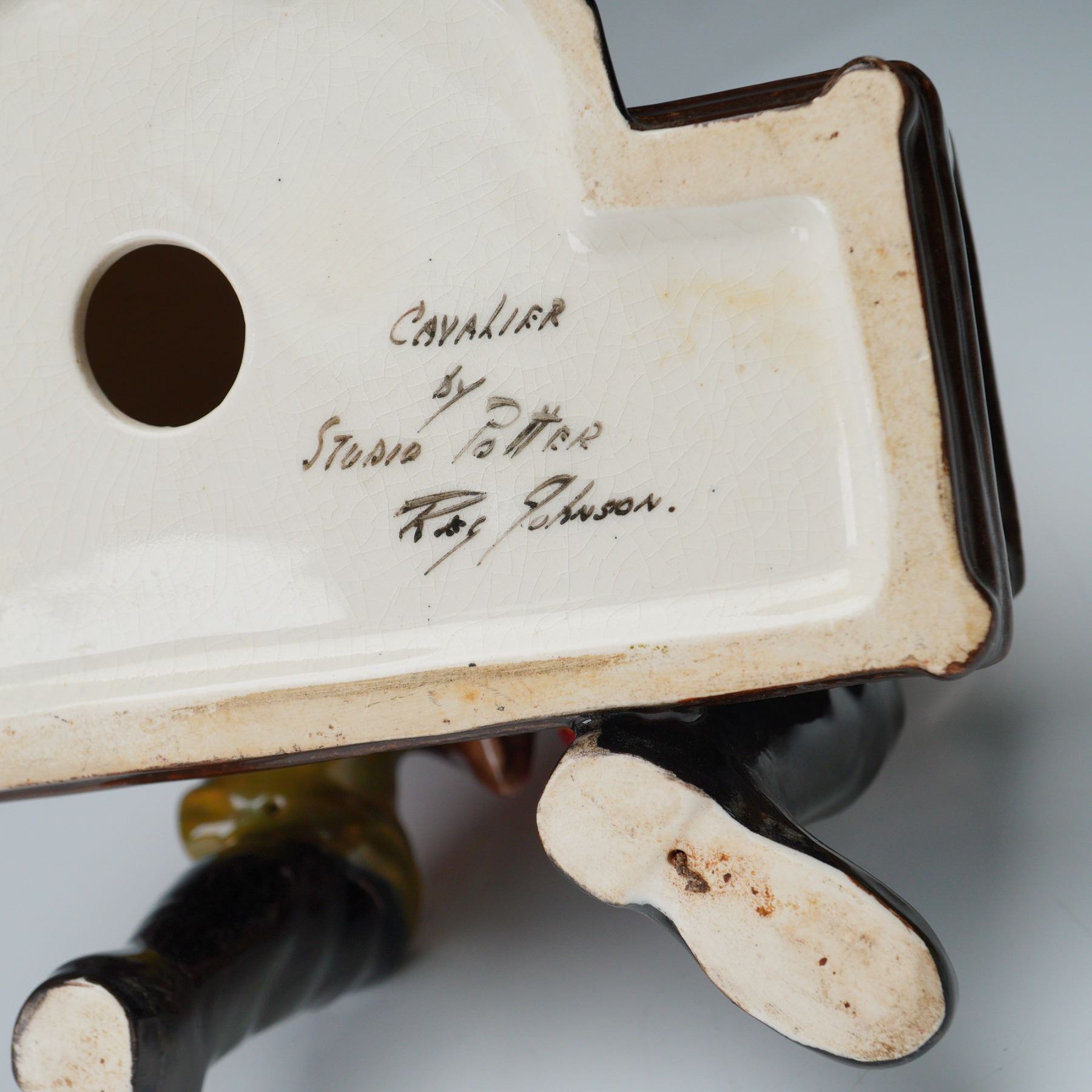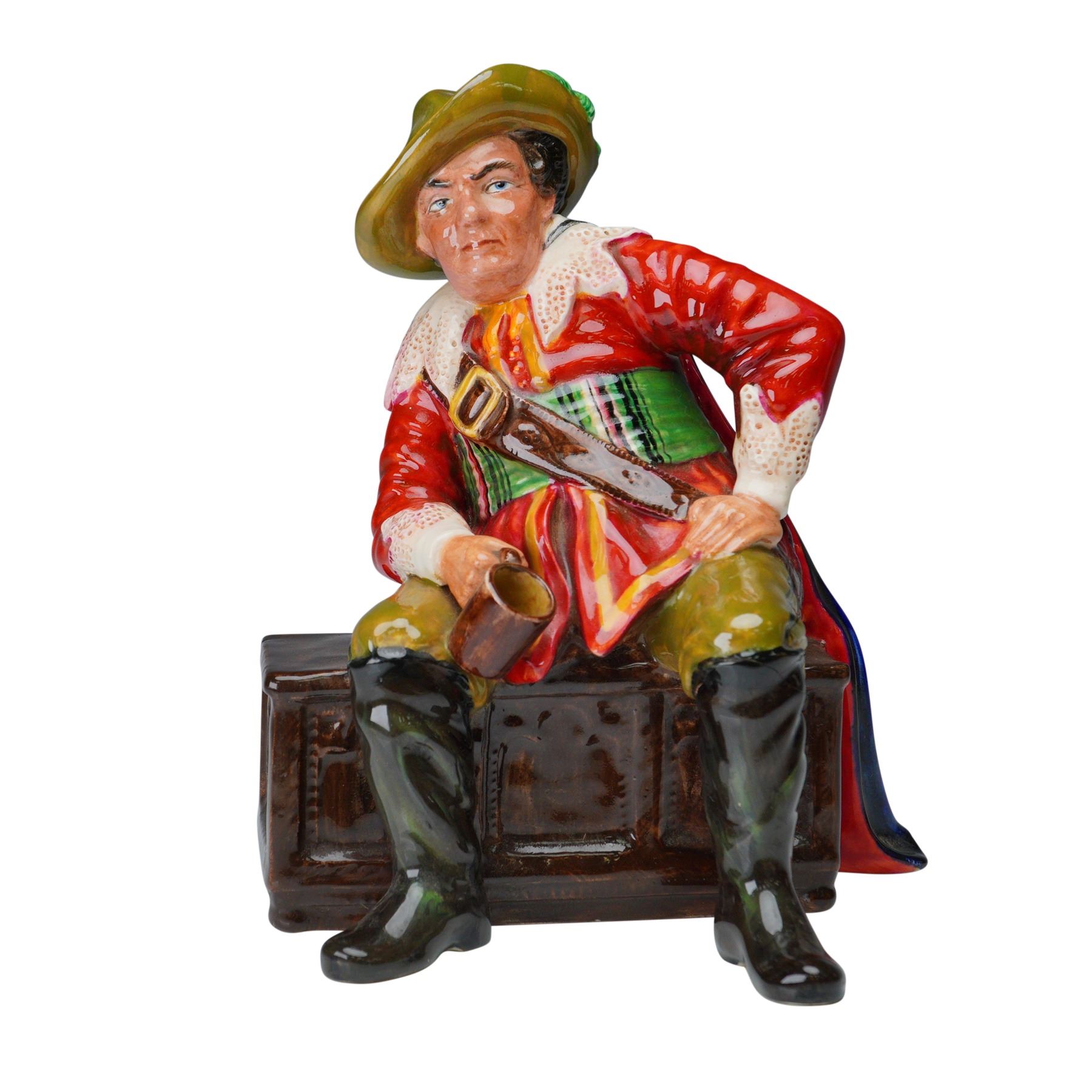 Boldly hand-painted in vivid hues of scarlet, olive, and emerald, this expressive seated figure of a cavalier captures the swagger and rest of a soldier at ease. The subject is depicted seated atop a textured trunk, holding a tankard in one hand, and dressed in 17th-century attire including a wide-brimmed hat with a feather, belted tunic, high boots, and flowing cape. Signed to the base "Cavalier by Studio Potter, Roy Johnson" in freehand script. A striking example of mid-century English studio pottery, combining character study with decorative charm. Measures 8.75"H.