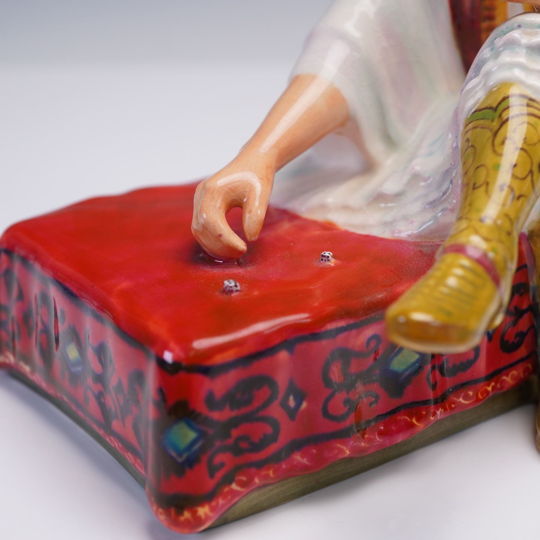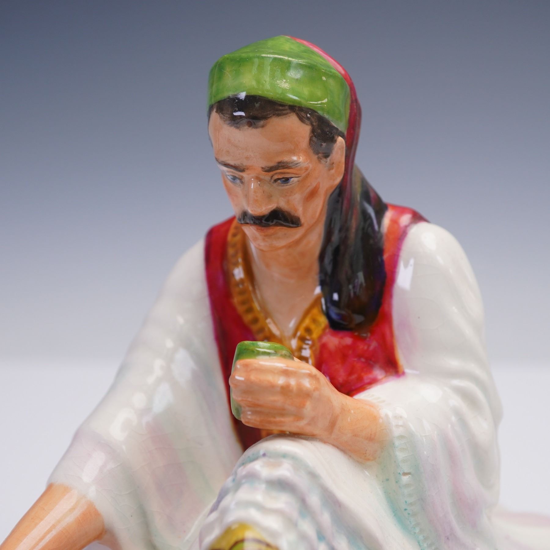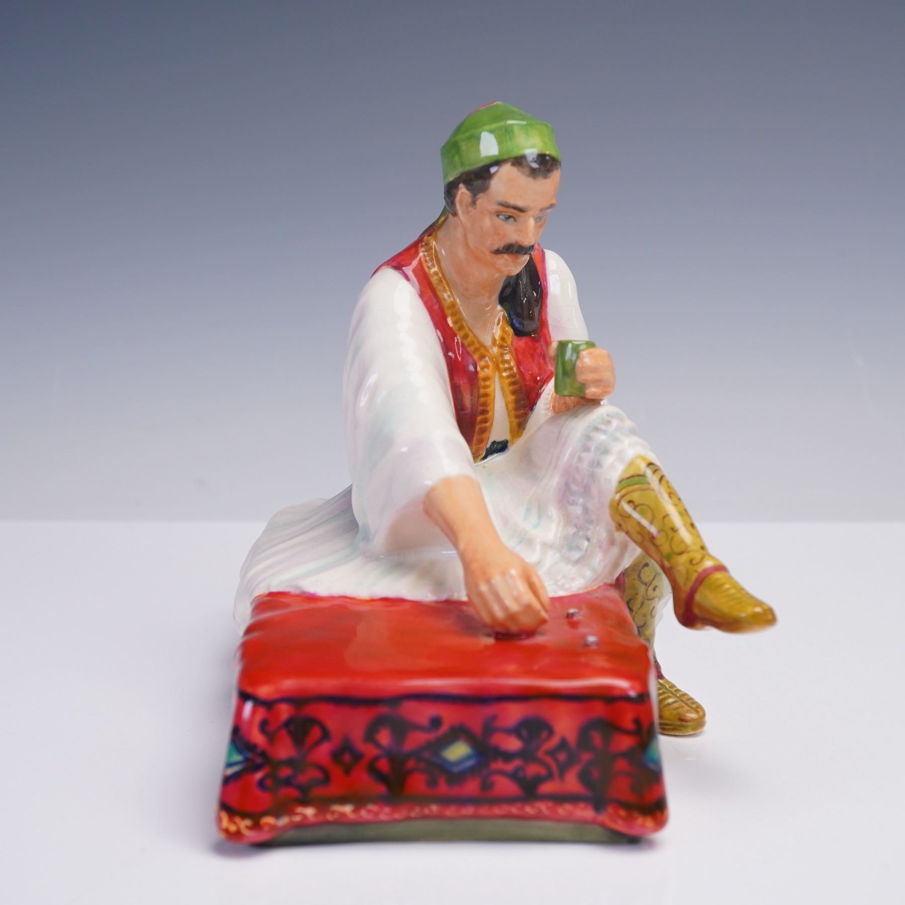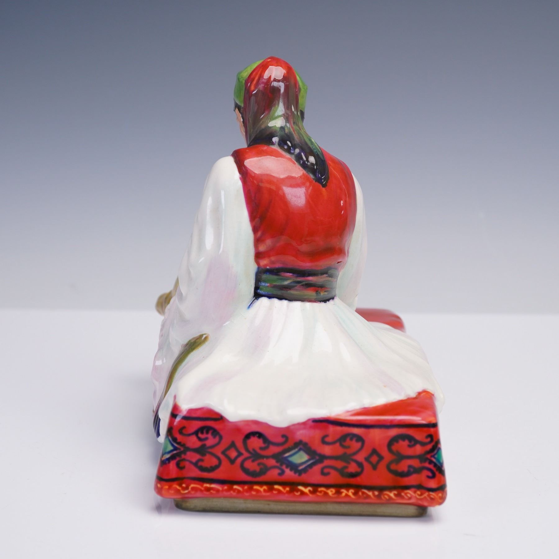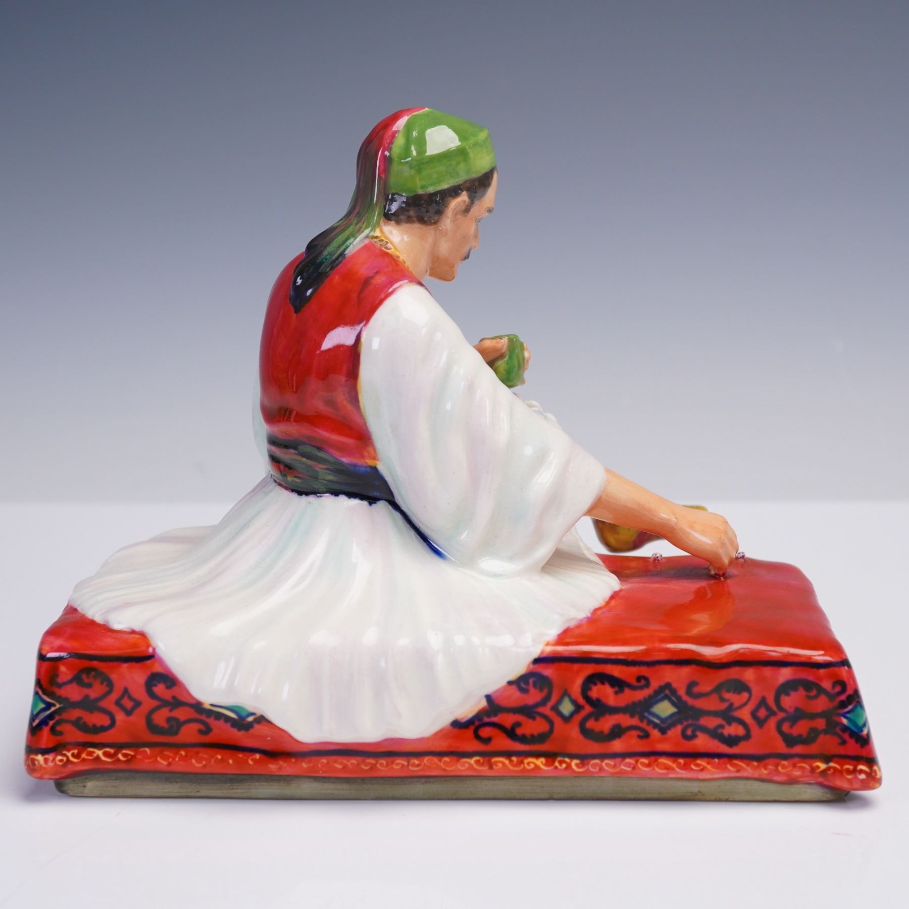 This ceramic figurine titled Albanian Dice Thrower features a seated man in traditional Albanian attire, poised mid-game on a red patterned cushion. Richly hand-painted and inscribed on the underside.