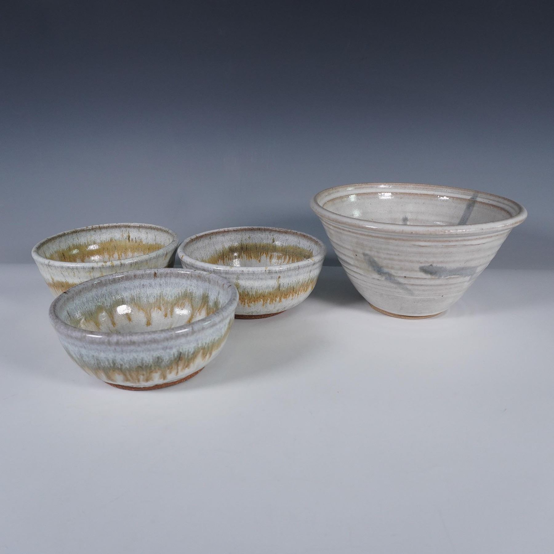 A set of four handcrafted studio pottery bowls, including one large mixing bowl and three smaller serving bowls. Each piece features earthy, natural glazes in hues of gray, green, and ochre with a glossy finish, highlighting the wheel-thrown ridges and organic forms. The larger bowl is signed and dated Dale 89 on the base, suggesting a mid-century American studio origin. A lovely set showcasing the aesthetic and craftsmanship of late 1980s studio pottery. Bowl sizes - small 2.25"H x 5" dia. and conical bowl 4"H x 7" dia.