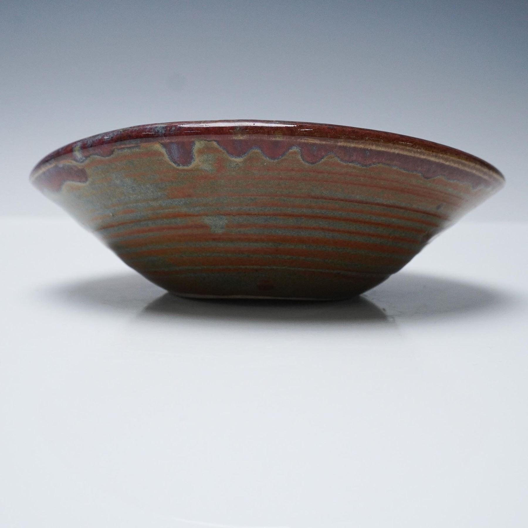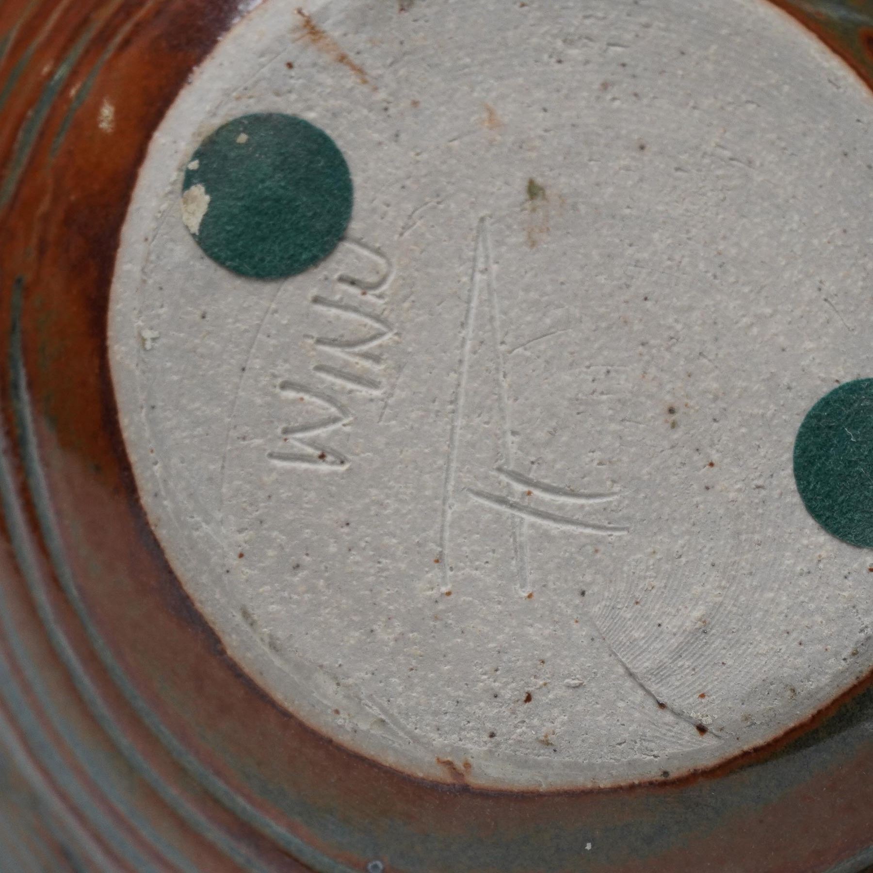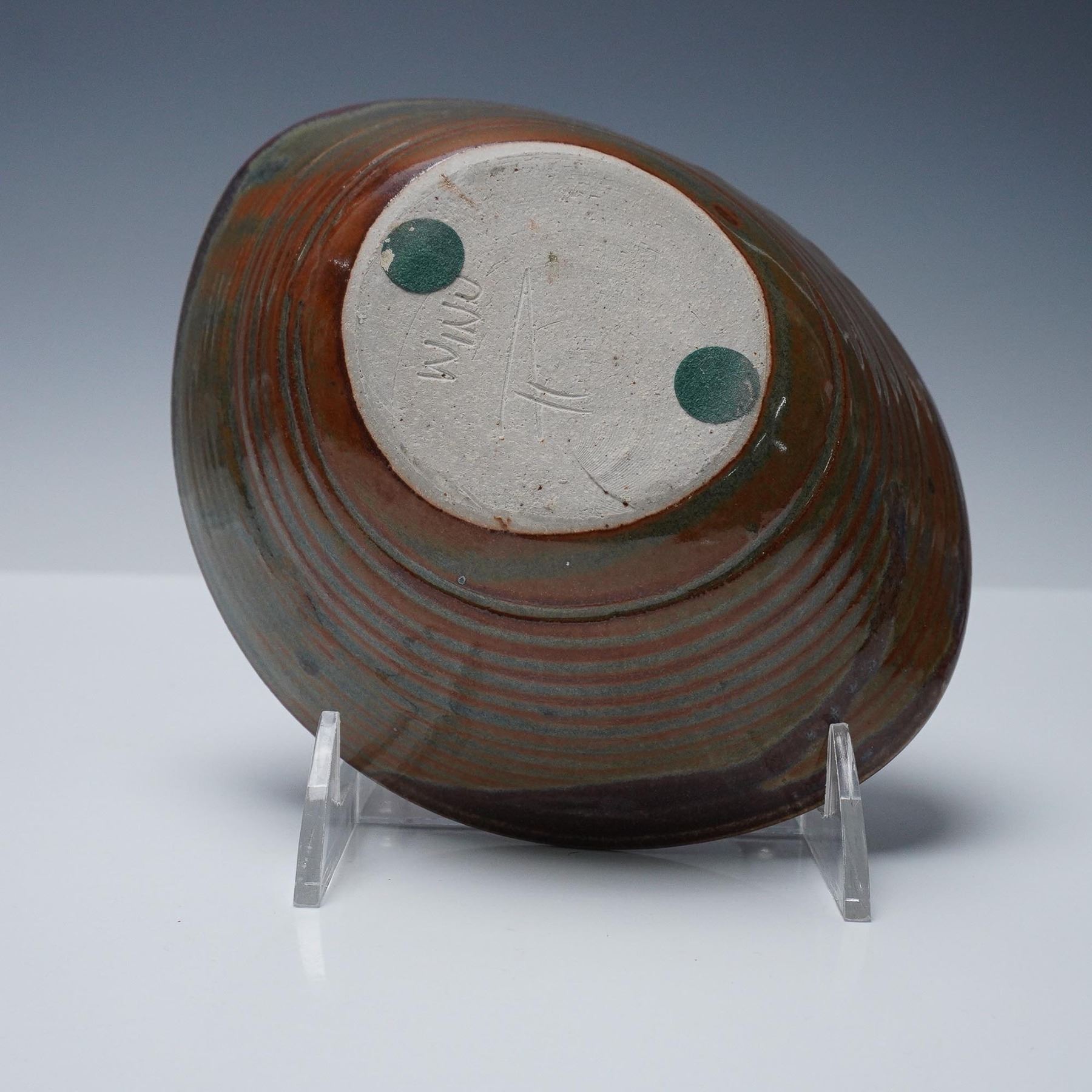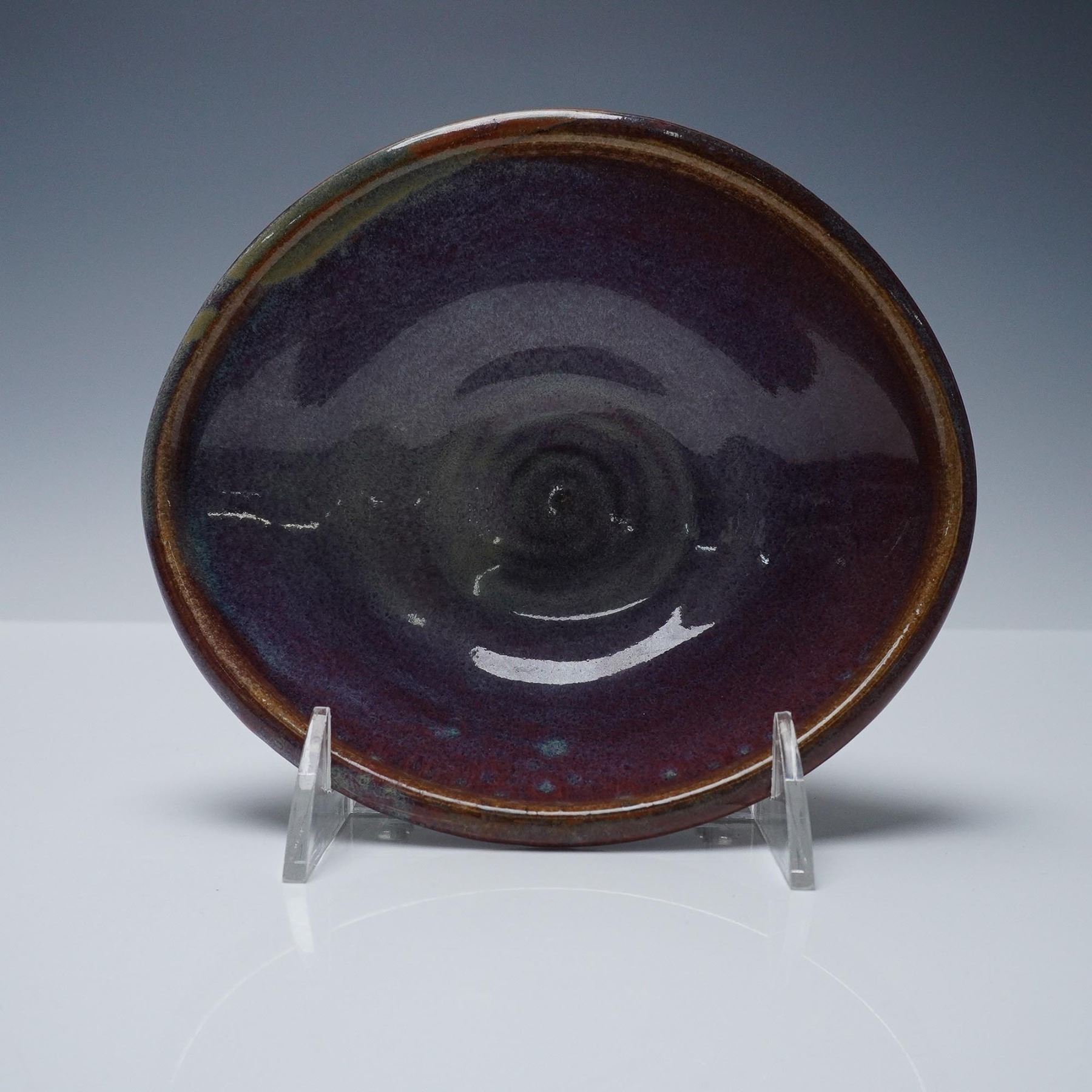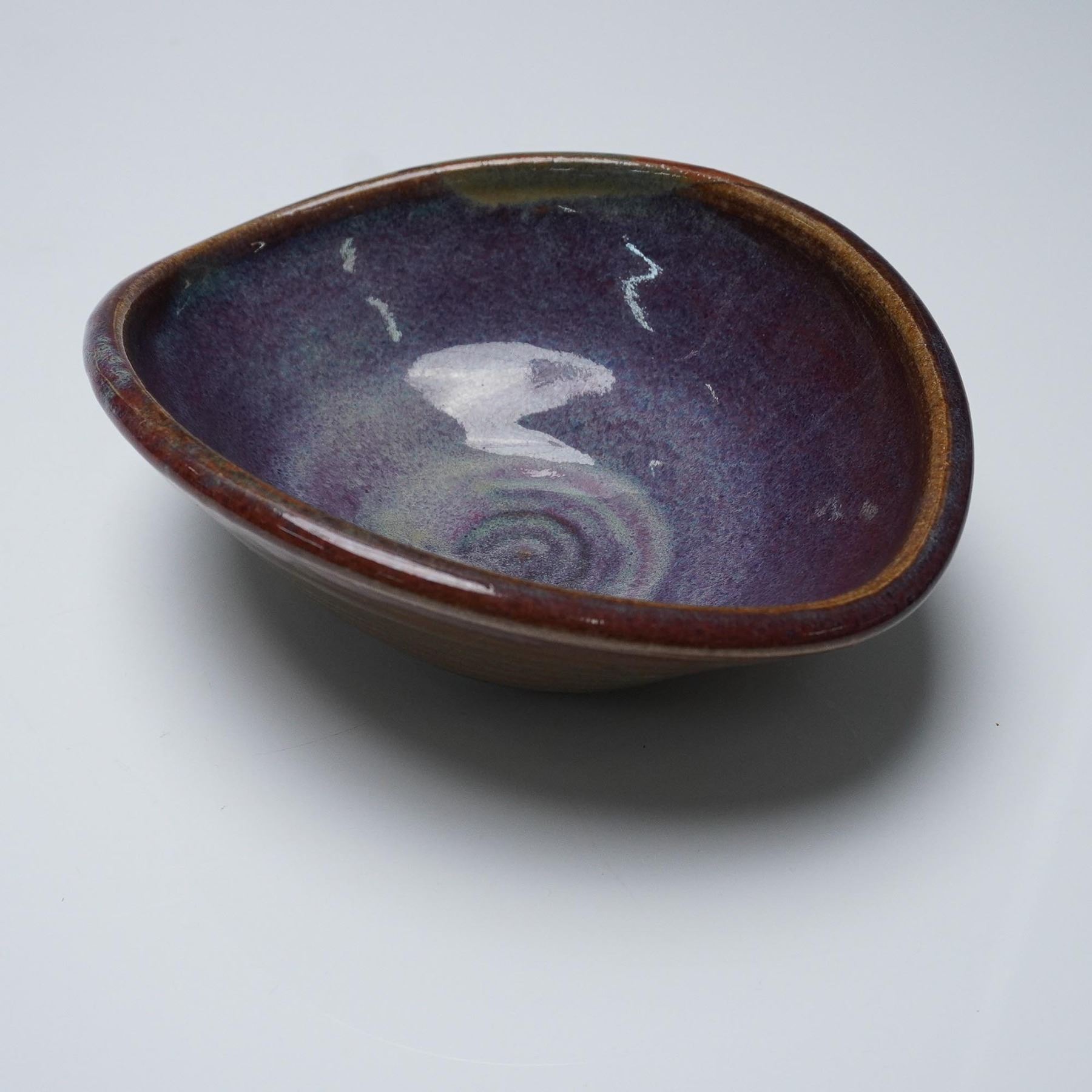 Striking studio art pottery bowl with a distinctive hand-thrown, asymmetrical form. The interior showcases a stunning blend of deep violet, plum, and slate tones with a high-gloss glaze, creating a swirling, cosmic effect. The exterior is finished in earthy hues of rust and green with carved horizontal ridges adding tactile texture. The base is inscribed with the artist's signature. This one-of-a-kind piece captures the essence of modern studio ceramics with its expressive glazing and organic shape.