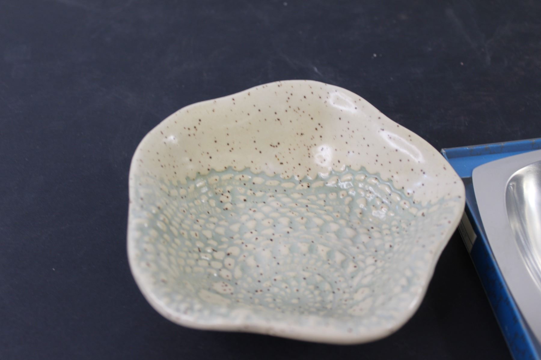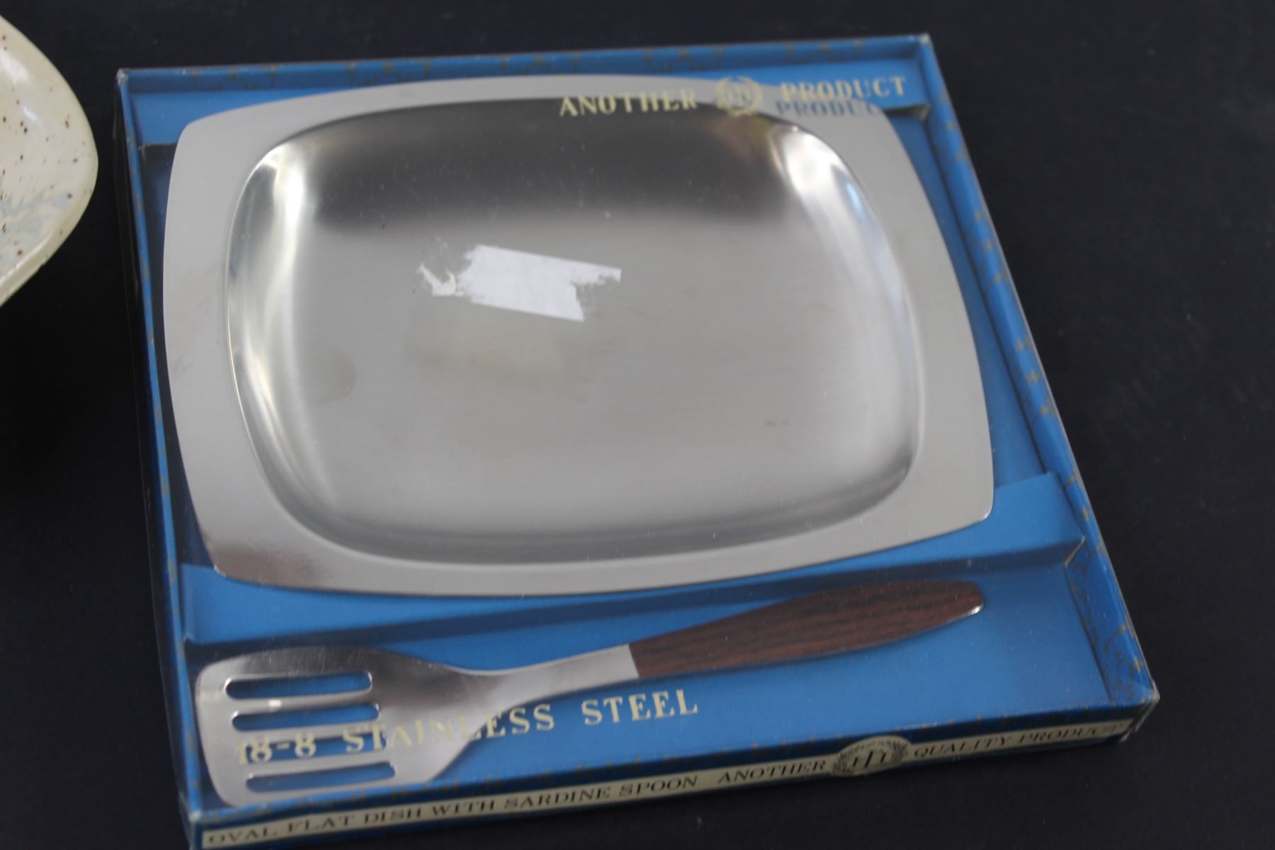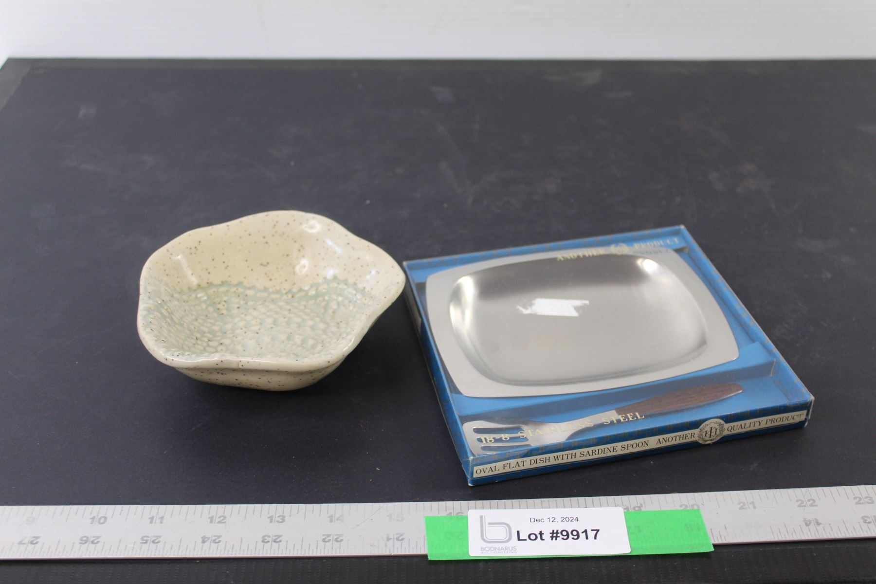 Studio Pottery Bowl, Stainless Steel Oval Flat Dish With Sardine Spoon
