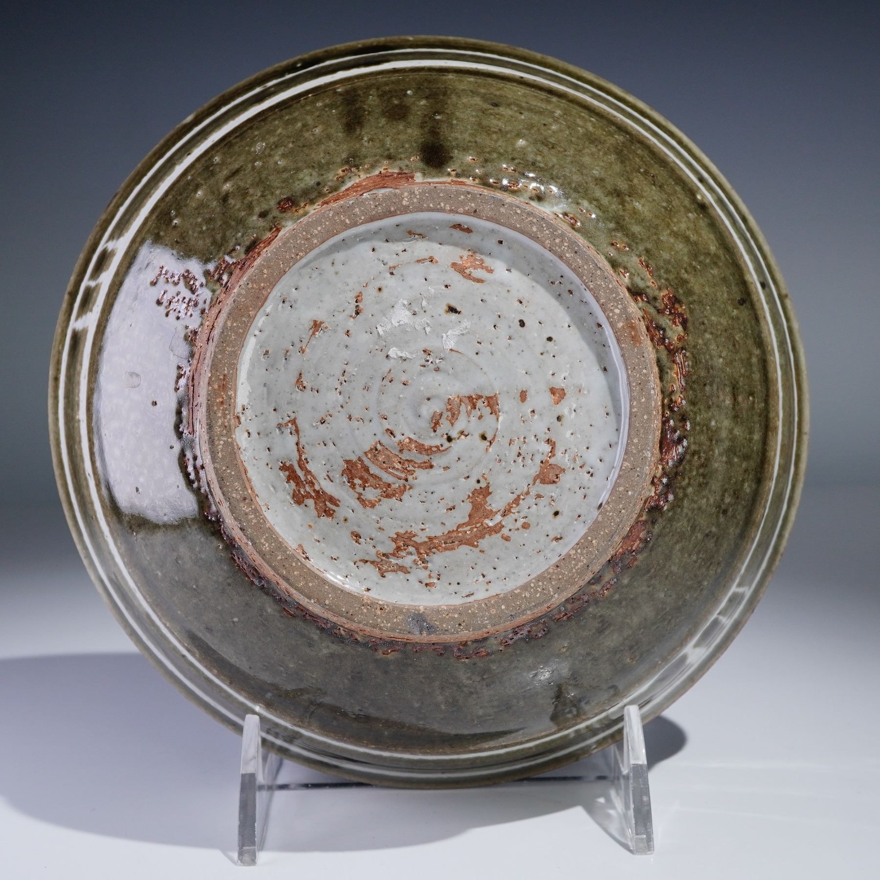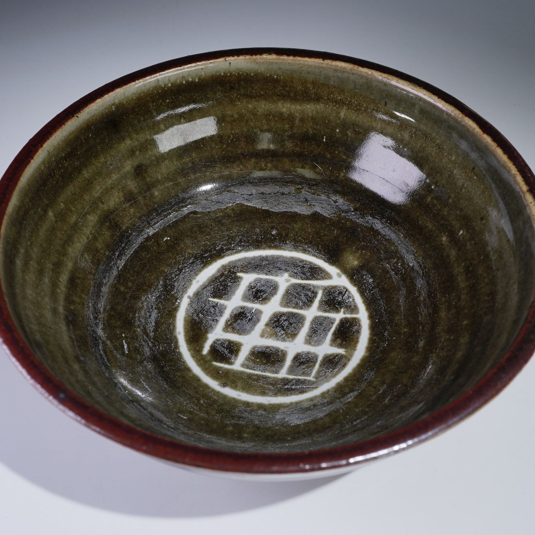 Wheel-thrown studio pottery bowl with rich brown and olive-green glaze, featuring white slip accents forming a subtle banded design on the exterior. The interior is glazed in dark tones with a geometric lattice motif impressed in the center. The foot and underside reveal the natural reddish clay body partially covered in a light ash glaze. Measures approx. 2.75"H x 7.75"dia.