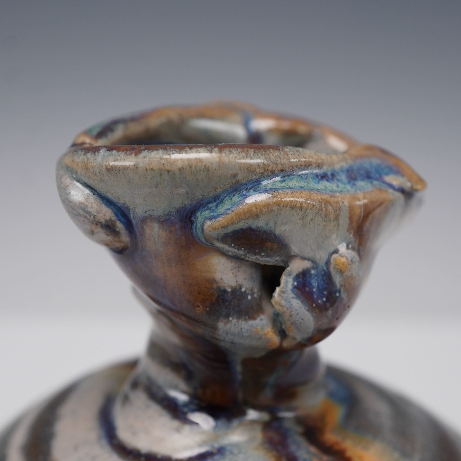 A wheel-thrown studio pottery vase signed Raymond with an impressed mark to the base, featuring a bulbous body and narrow neck finished with an expressive crimped and folded rim. The richly glazed surface displays a painterly interplay of colors - deep teal, olive, ochre, rust, and lavender - within a glossy, speckled gray ground. Broad circular striations from the throwing process are visible beneath the glaze, enhancing its handmade character. Both the form and finish reflect a modern ceramic sensibility rooted in organic, gestural design. A striking and unique decorative vessel by a skilled studio potter.
