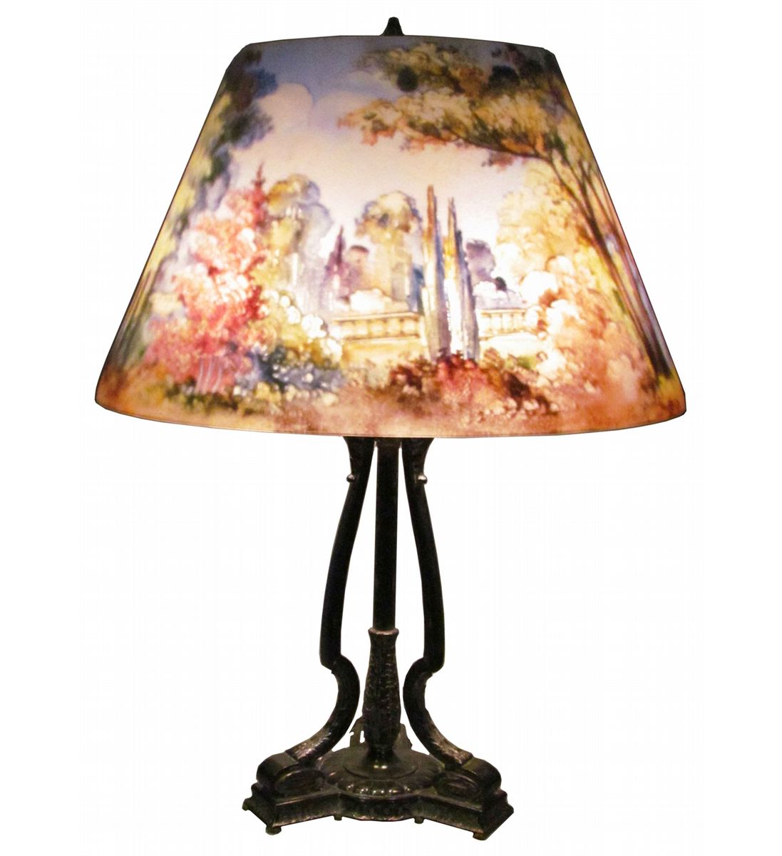 Stueben Reverse Painted Glass Lamp Shade with Handel Table Base. Shade measures 16 inch diameter X 22 inches tall.