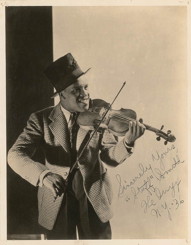 Vintage pearl-finish 8 x 10 photo of Smith wearing a top hat while playing his violin, signed in fountain pen, “Sincerely yours, ‘Stuff’ Smith, The Onyx, N.Y. ‘36.” A few light dings and impressions, and tack holes to the corners, otherwise fine condition.