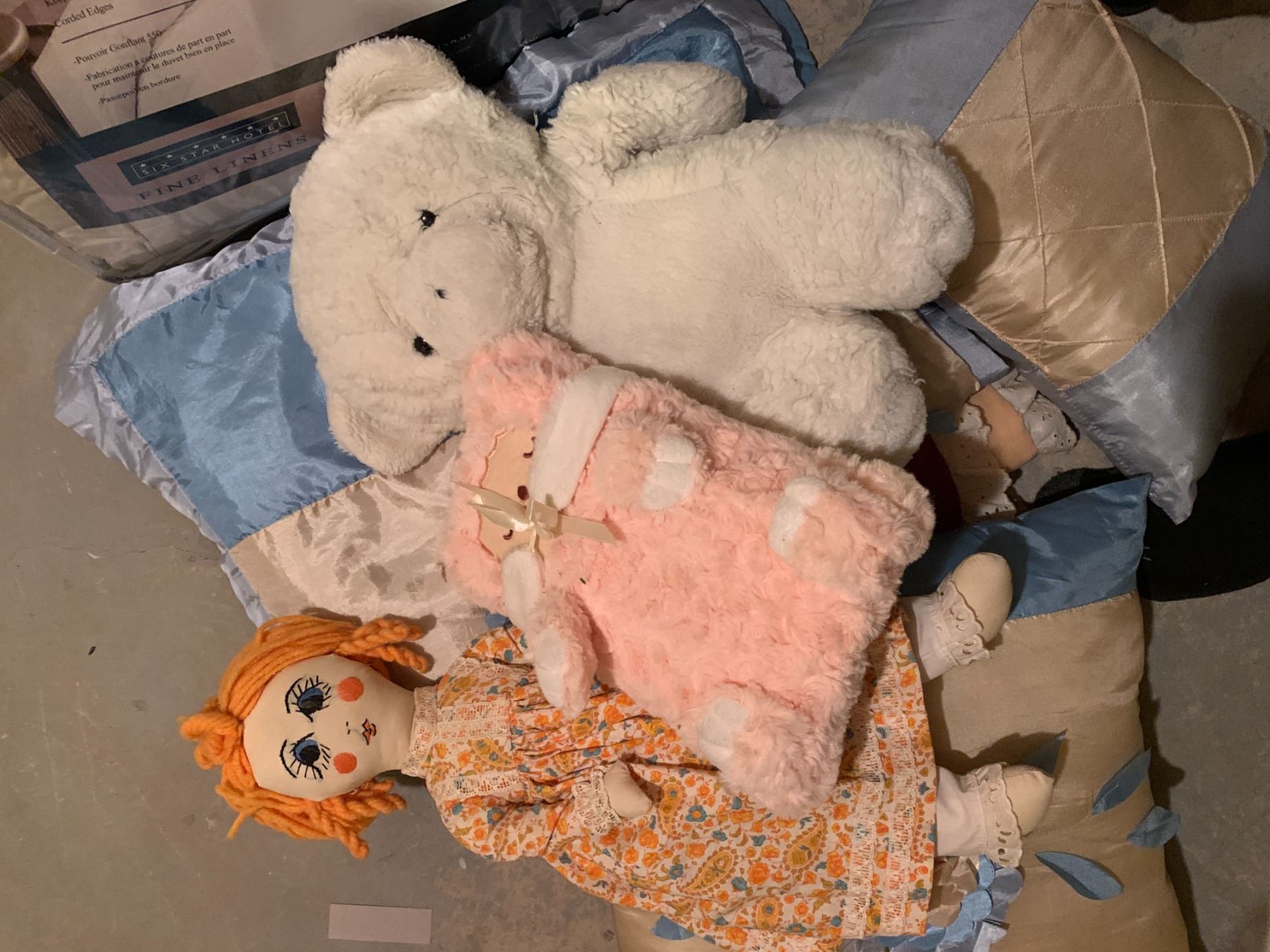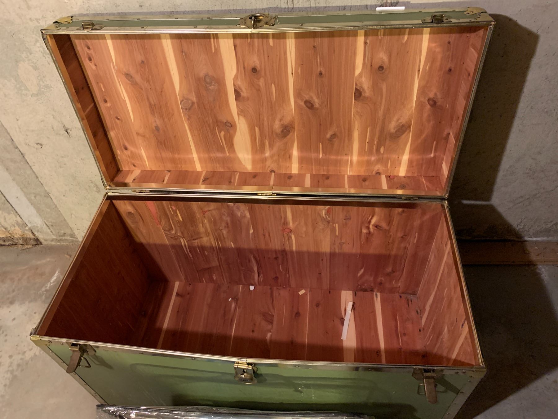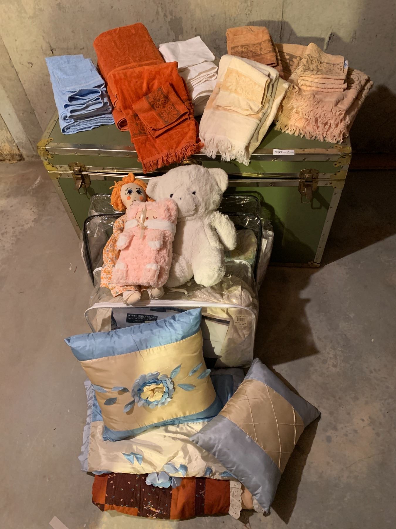 Stuffed Animals, Pillows, Linen, Towels, and a Green Cedar-Lined Storage Trunk