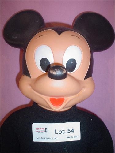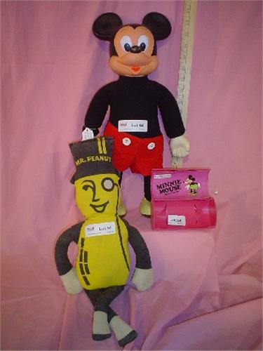 "Mickey Mouse" stuffed doll w/vinyl head & hands. Disney by Hasbro (In good shape) & Planters "Mr. Peanut" stuffed rag Advertising doll (has a tear under right arm) & "Minnie Mouse" plastic wrist watch case