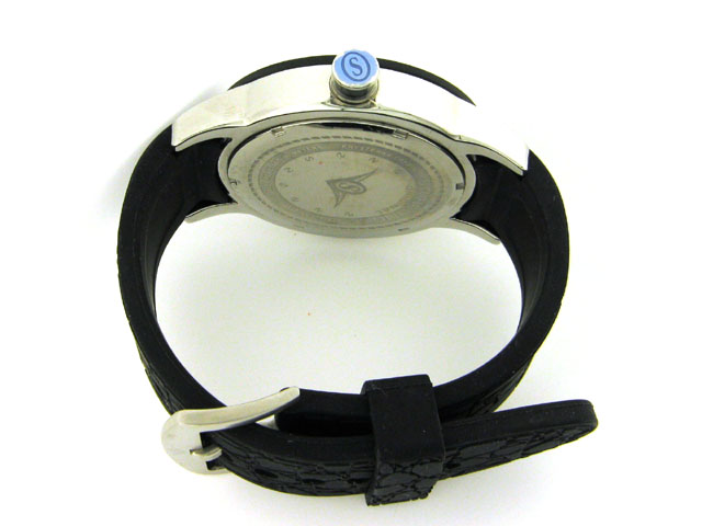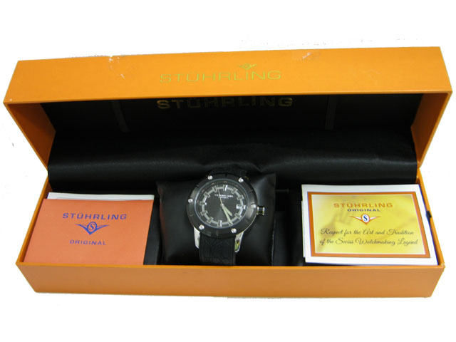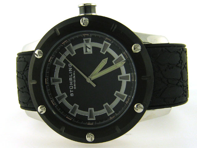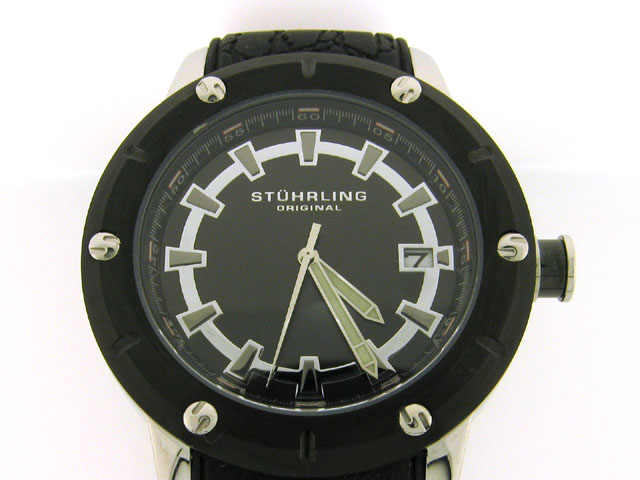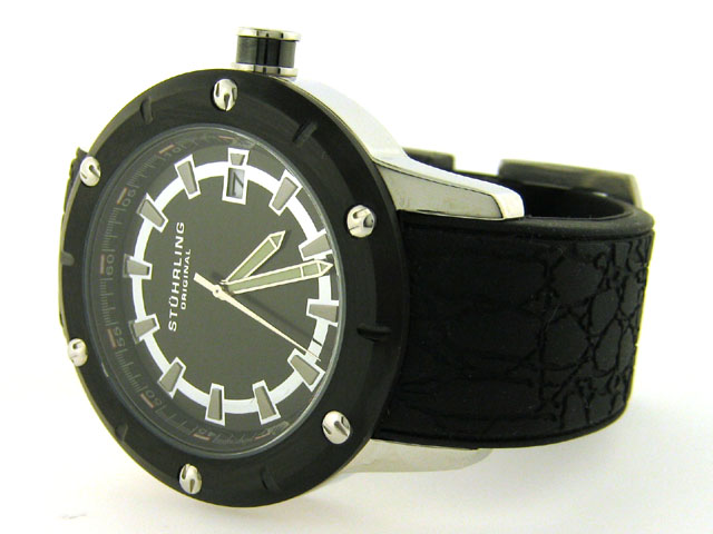 This is a Stuhrling 621 Torino Sports Quartz RGP Mens Watch with the following features: Quartz movement; Krysterna crystal; Push/pull Crown; Rubber band with Stainless steel Buckle; Band Measures 9-1/2" L x 24mm W; Case diameter: 49mm; 3H-9H: 48.3mm; 6