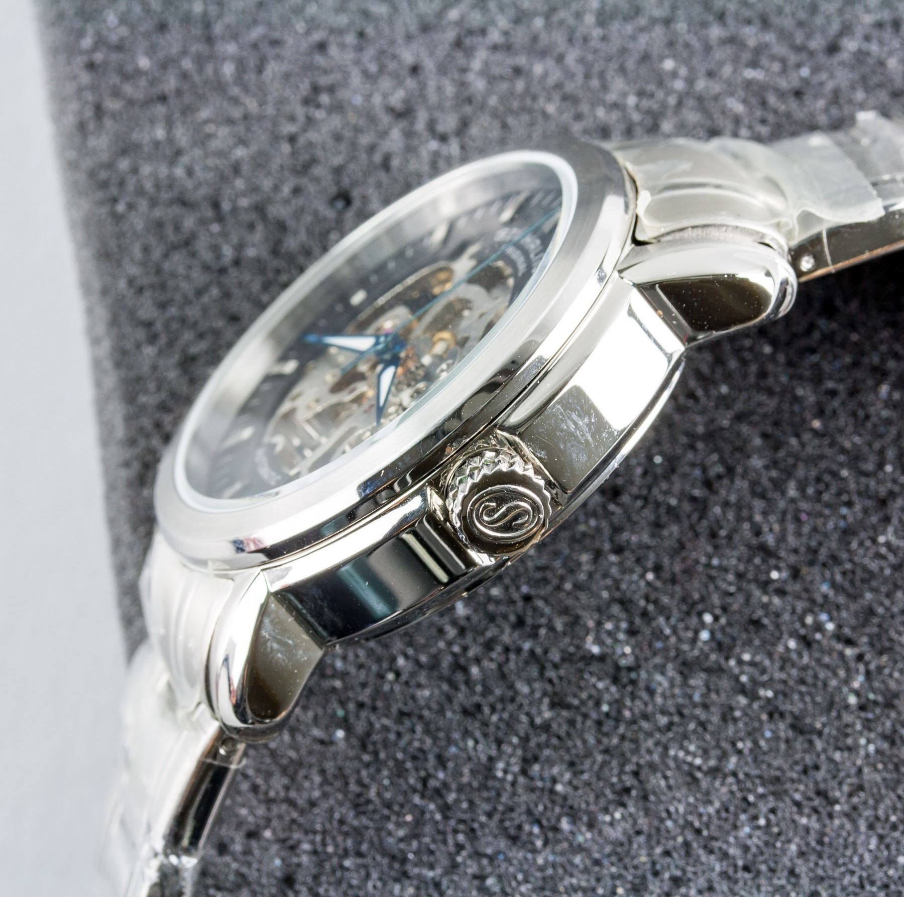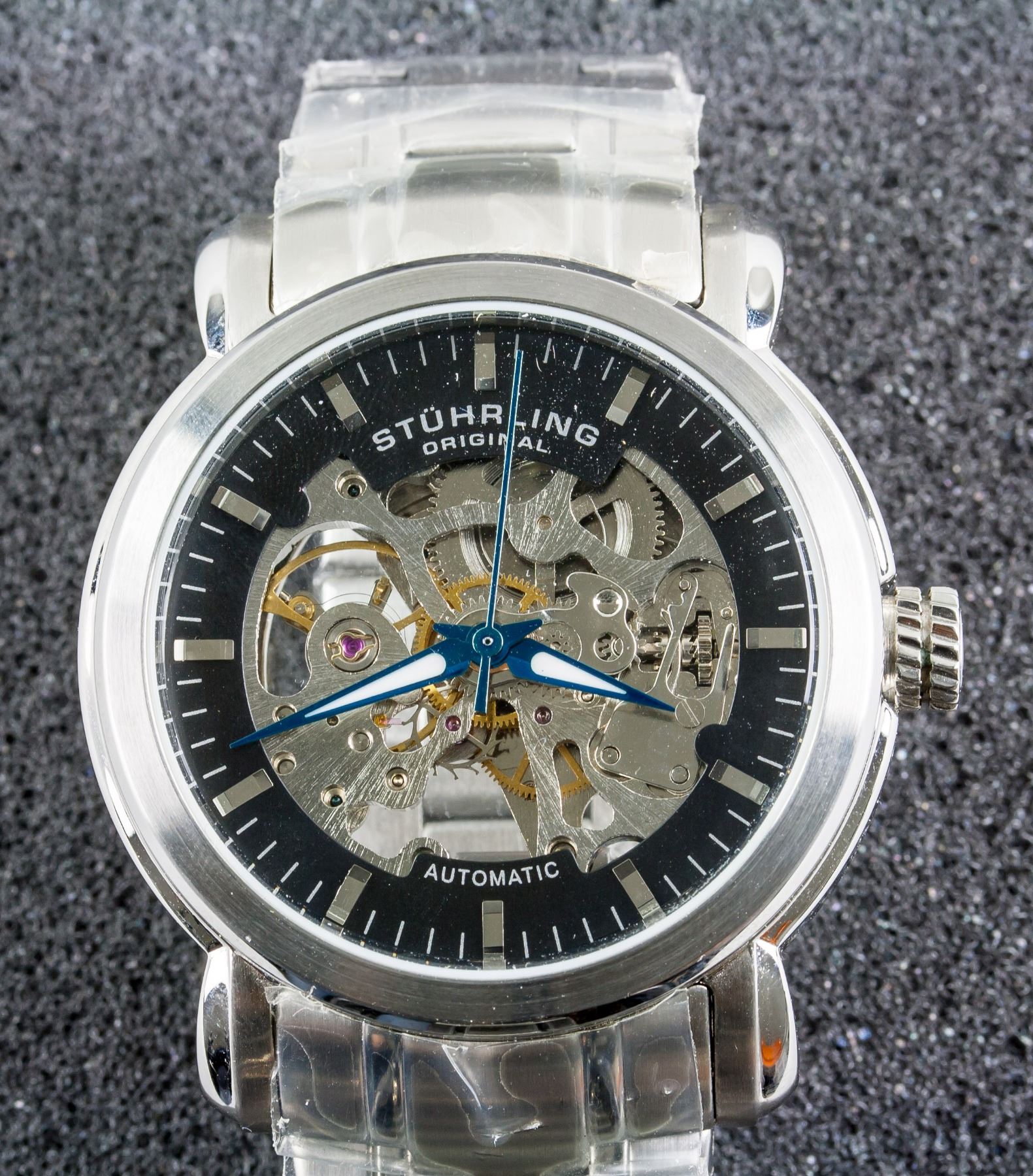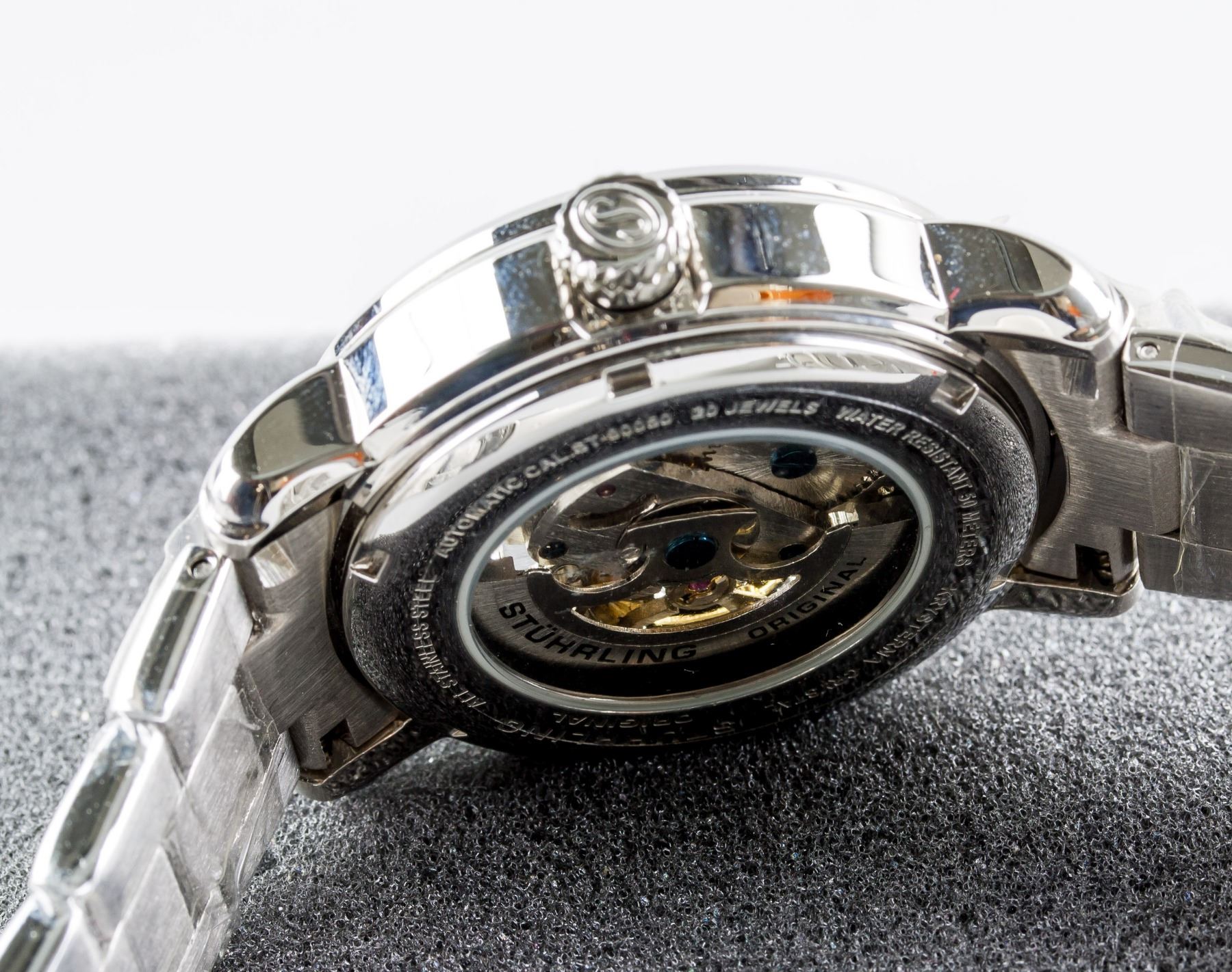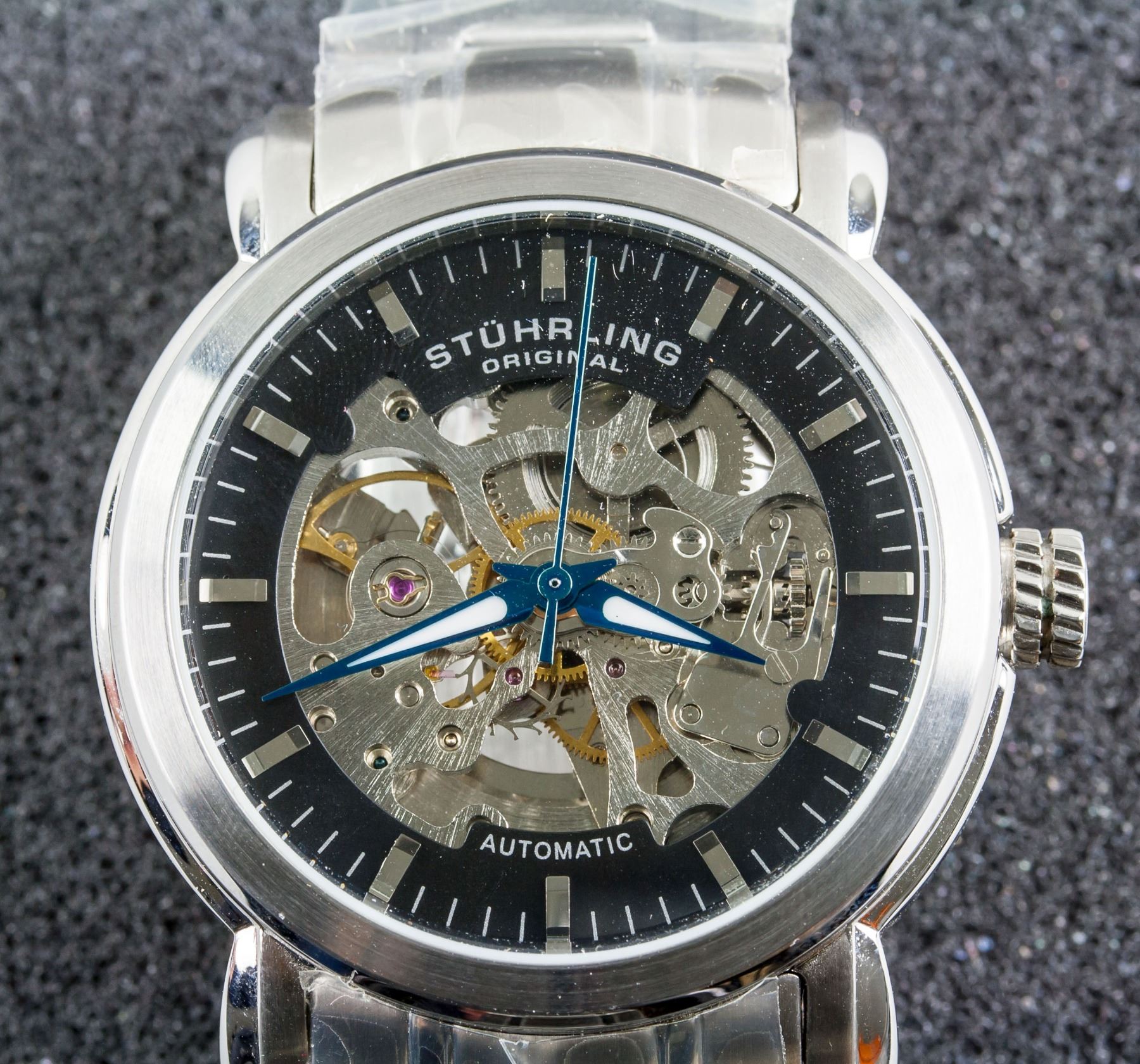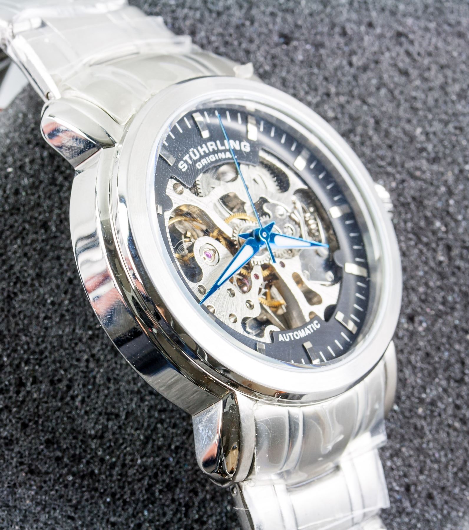 Stuhrling analogue skeleton watch, automatic, all stainless steel, water resistant up to 50 meters, 20 jewels, CAL.ST-90050. Retail value $500.