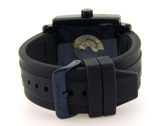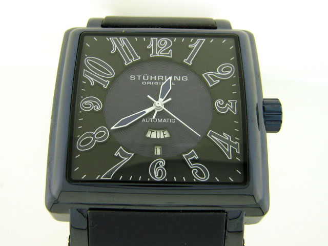 This is a Stuhrling Manchester Ozzie Watch with the following features: Square-Shaped 316L Surgical Grade Stainless Steel Step Design Curved Case; Hydraulically Pressed Guilloche Soleil Dial; Individually Applied Arabic Numerals Topped with Luminova™; Polished Convex Bezel; 3H-9H: 42mm (without crown); 6H-12H: 40mm (without lugs); Decorated Screw-Down Exhibition Curved Case Back; Krysterna™ Crystals; Stainless Steel Knurled Edge Crown (7.0mm) with 12 teeth and Embossed Logo; 5 ATM Water Resistant (50 meters/165 feet); Rubber band with Sturhling name; and Stainless Steel Tang Buckle with Stührling Signed Logo.