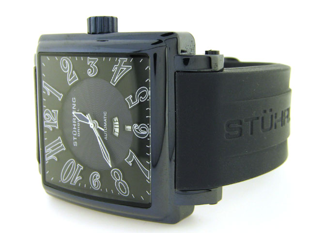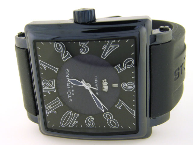 This is a Stuhrling Manchester Ozzie Watch with the following features: Square-Shaped 316L Surgical Grade Stainless Steel Step Design Curved Case; Hydraulically Pressed Guilloche Soleil Dial; Individually Applied Arabic Numerals Topped with Luminova™; Po