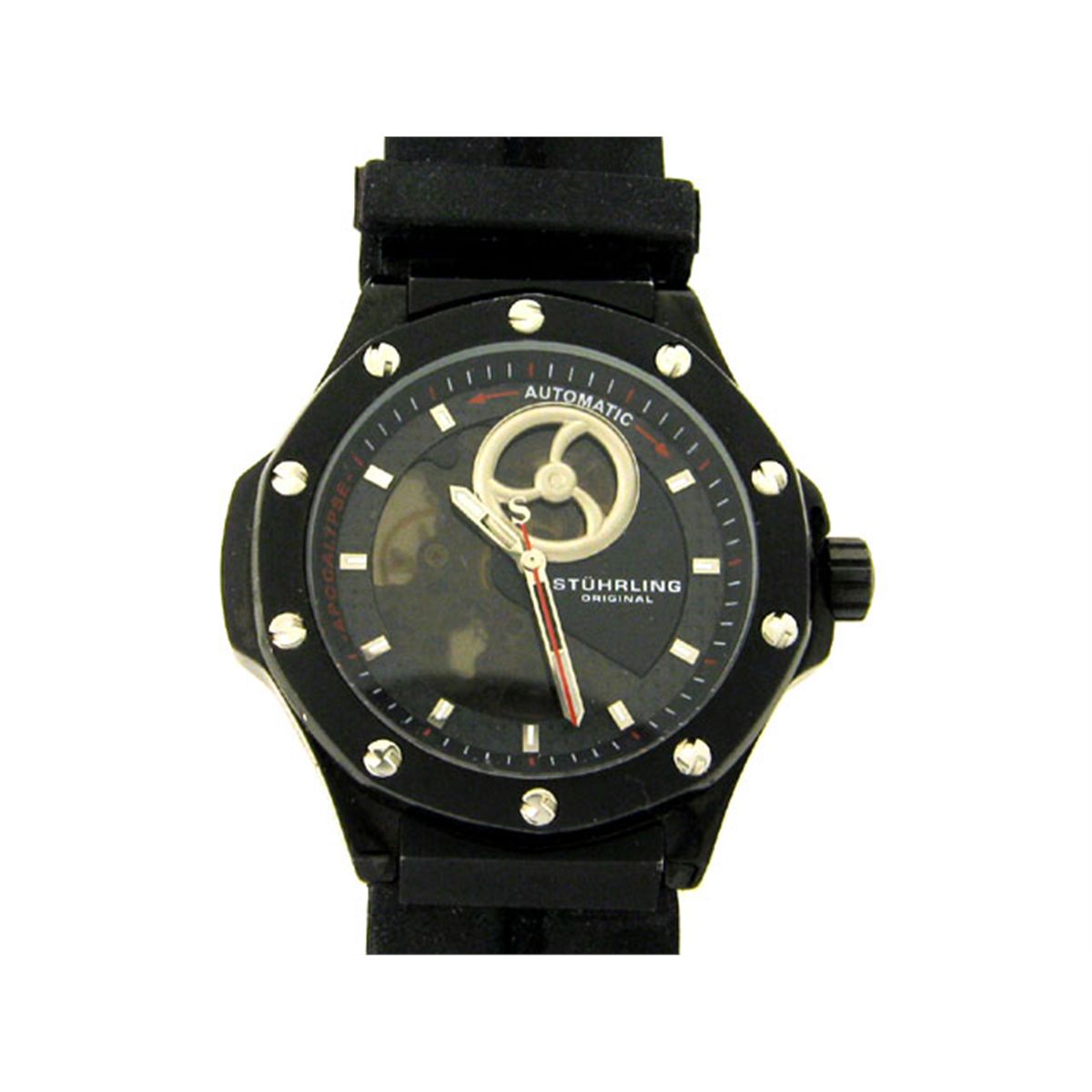 This is a Stuhrling Original Men's Sportsman "Apocalypse Skeleton" Automatic Watch with the following features: 20 Jewels Automatic Calibre ST-90089; Black PVD coated 316L Surgical Grade Stainless Steel; Case measures 47mm x 51mm; Krysterna Dial crystal; 9-1/2"L x 3/4"W Band Length; deployment clasp with safety latch & Stuhrling logo; and Water resistant.