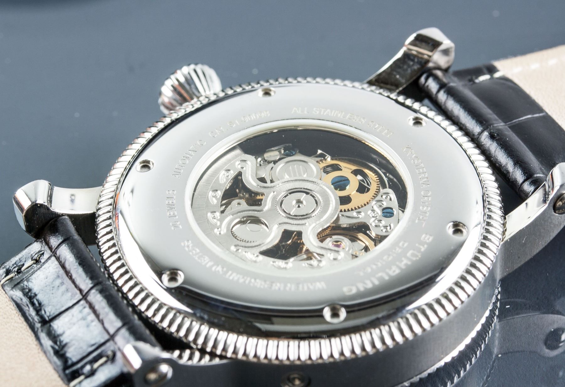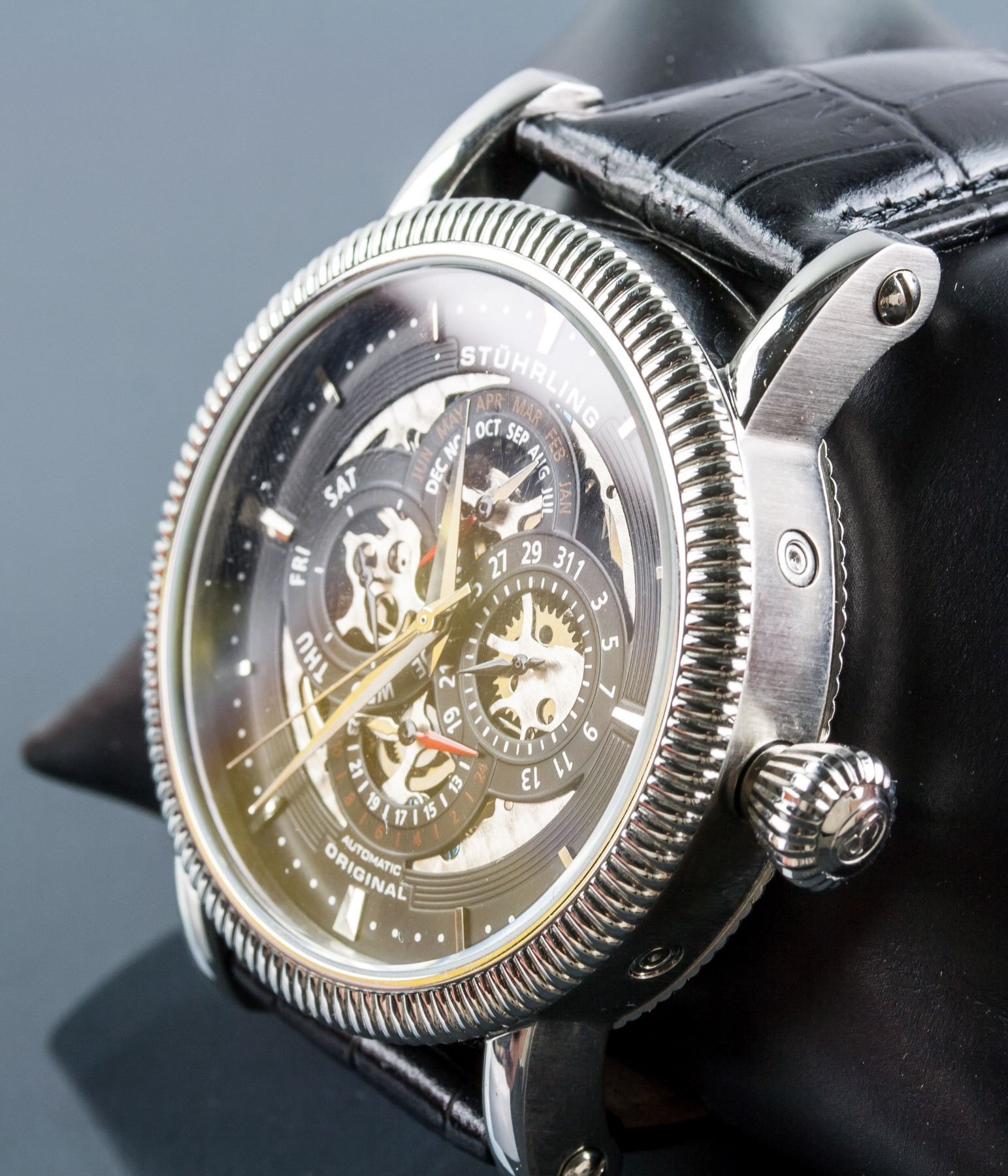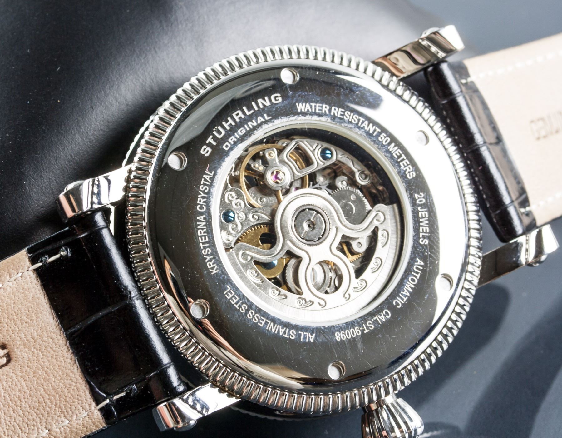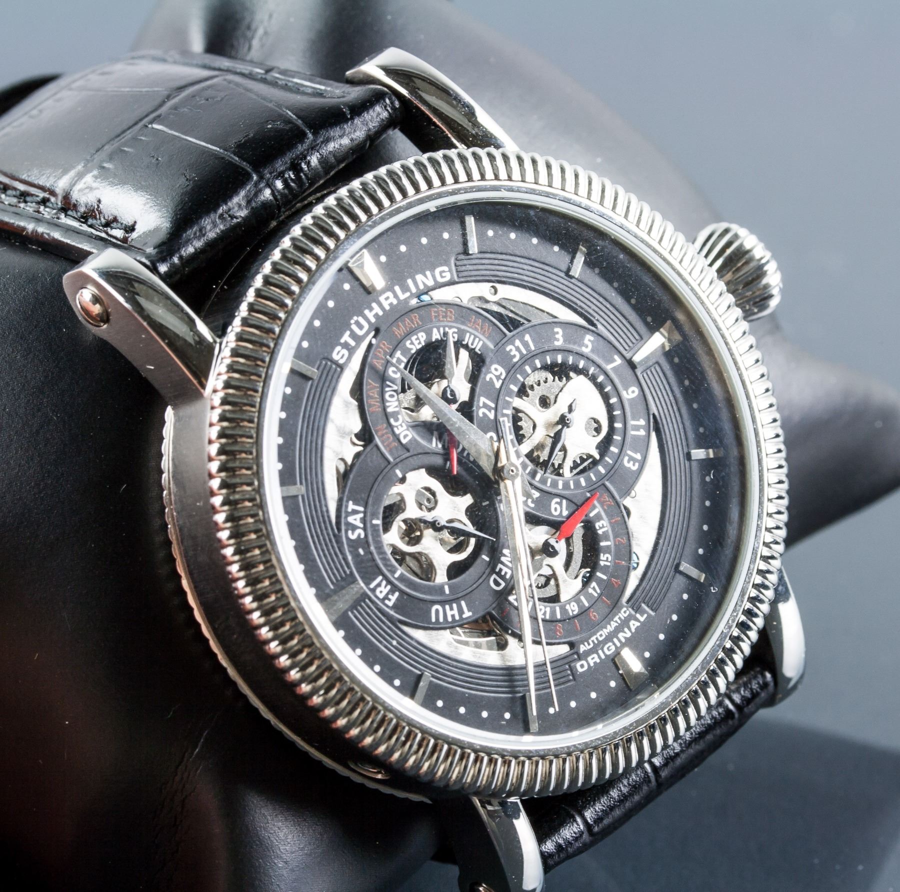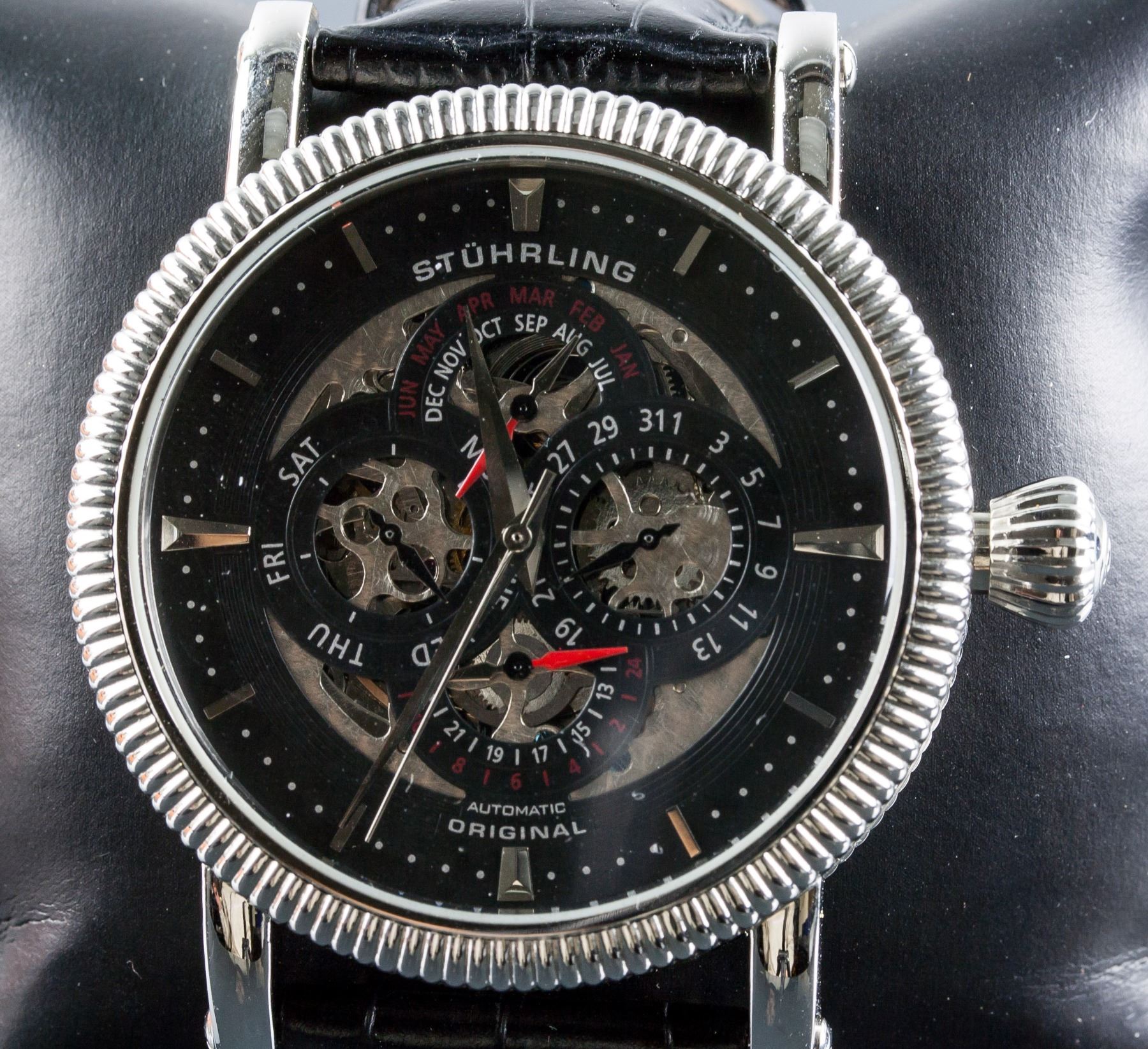 Stuhrling original men's automatic chronograph watch; stainless steel, krysterna crystal; water resistant up to 50 meters; CAL.ST-90098; genuine leather band