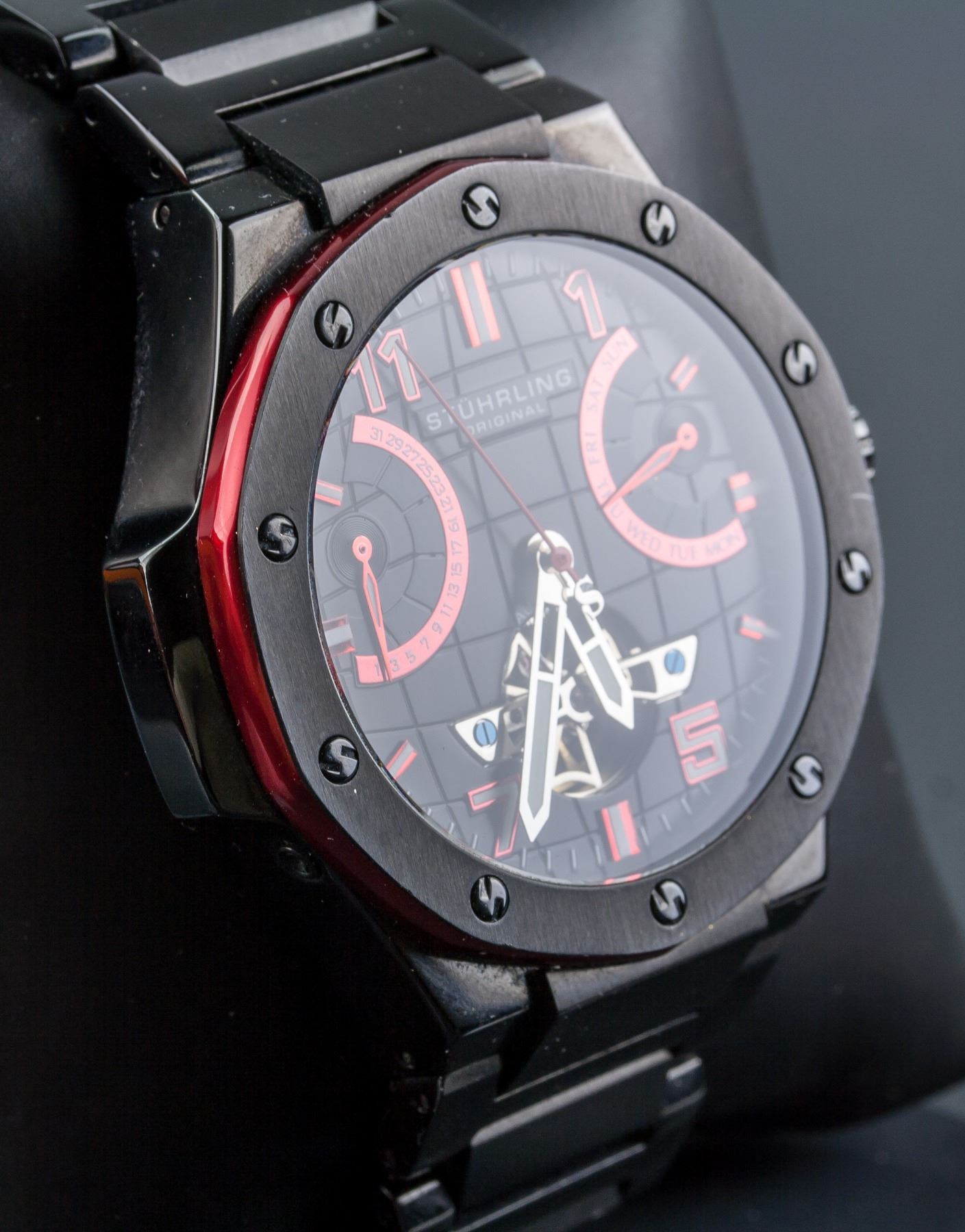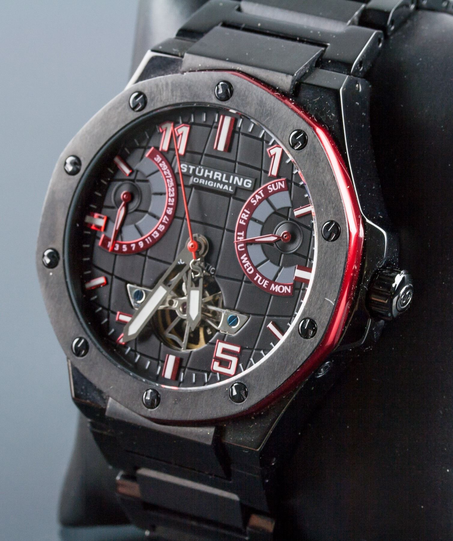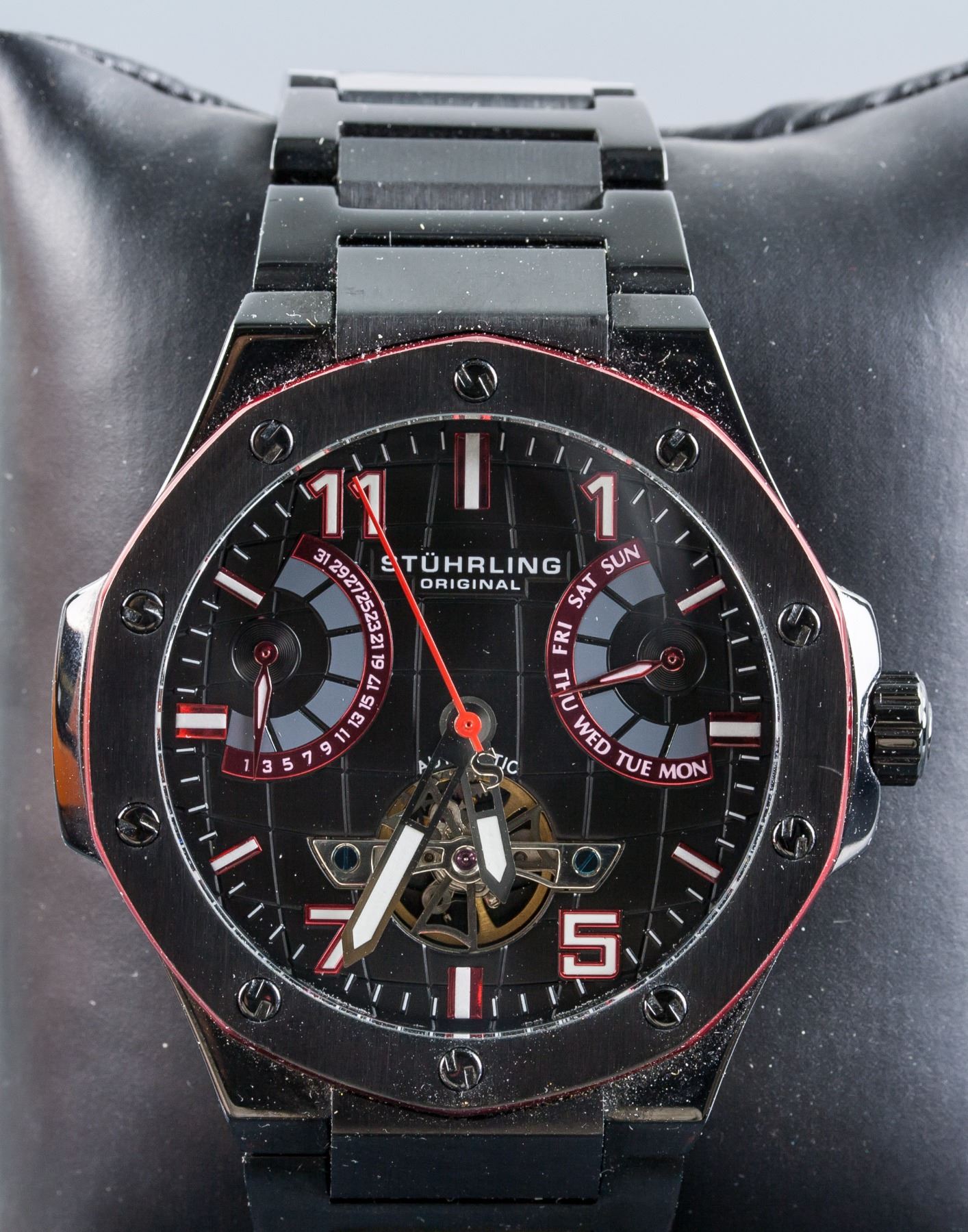 Stuhrling original men's automatic red and black automatic watch; stainless steel, water resistant up to 100 meters; CAL.ST-92504; with black stainless steel band