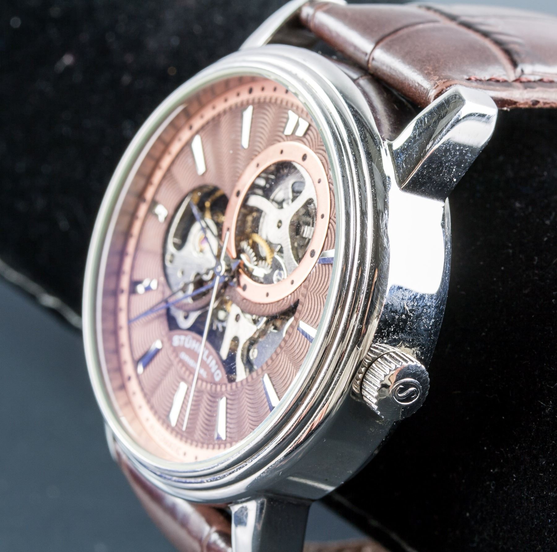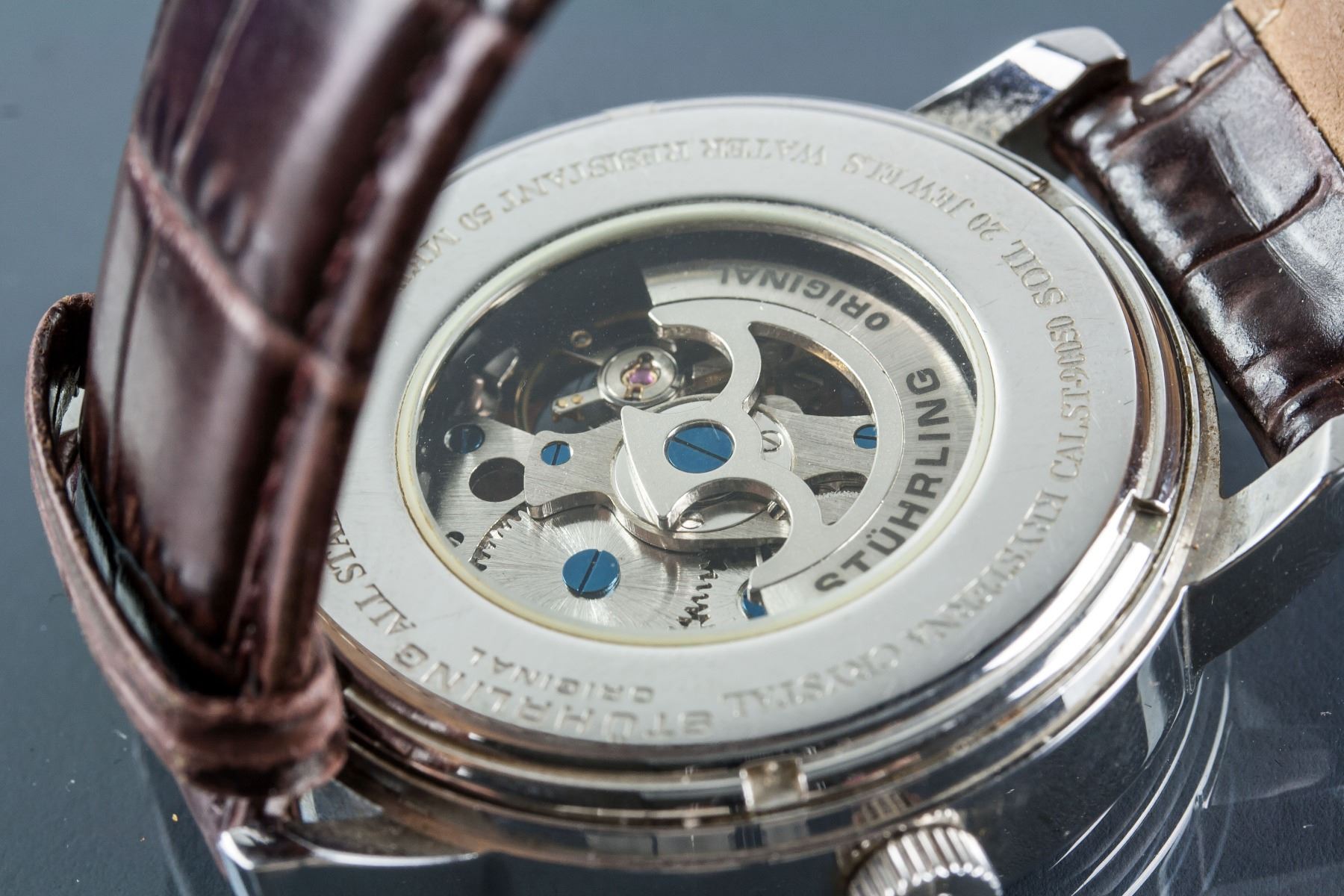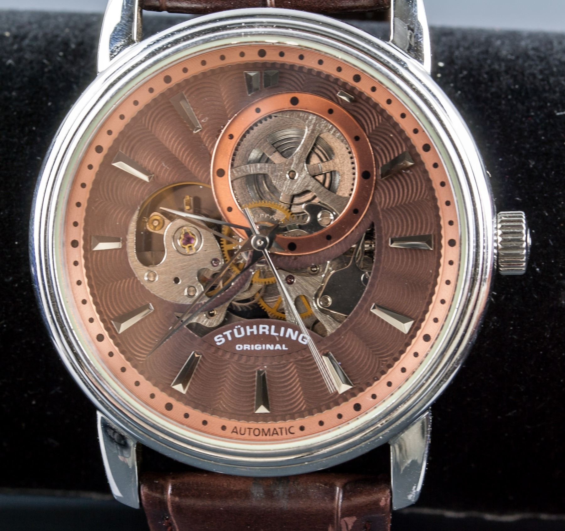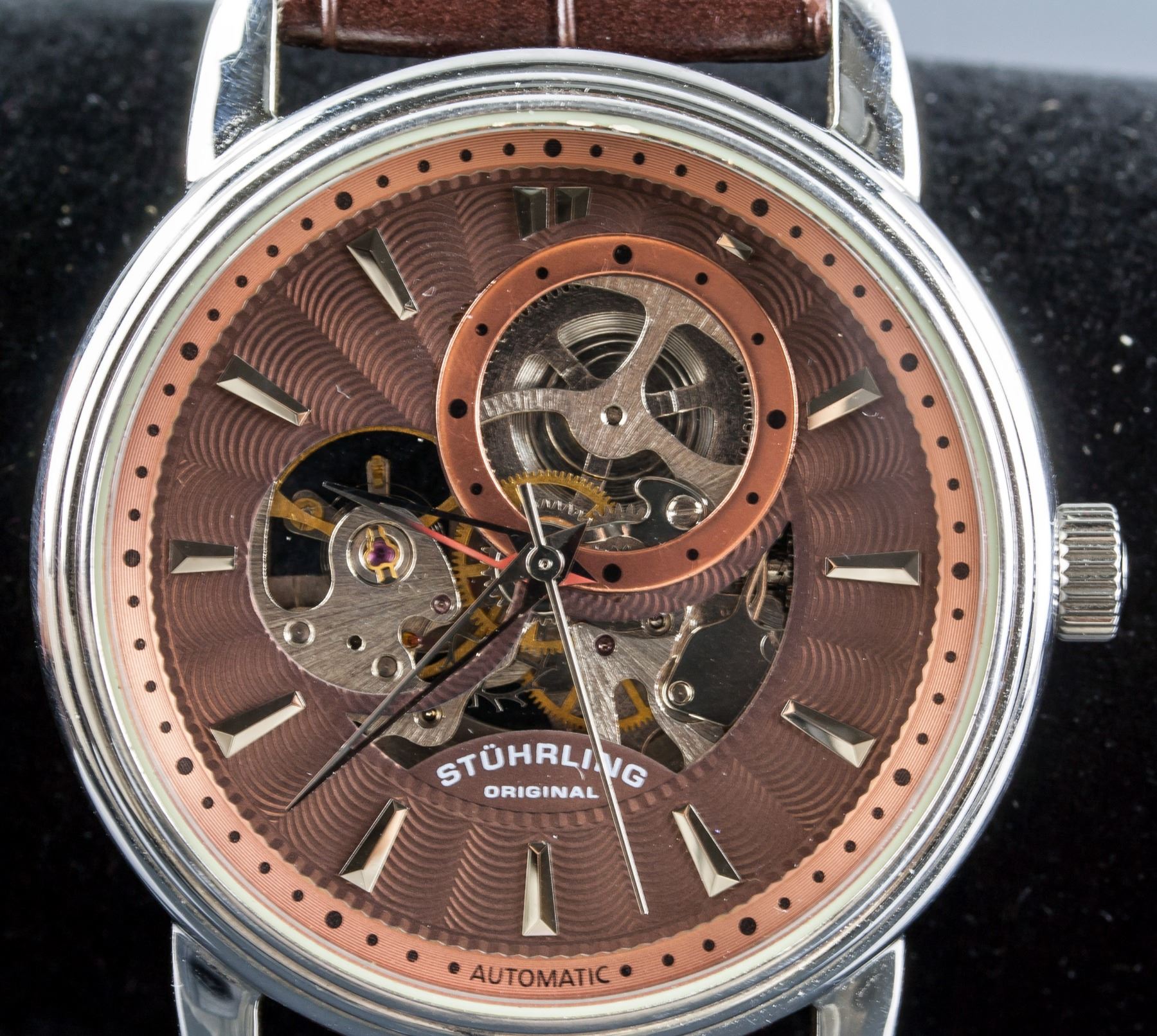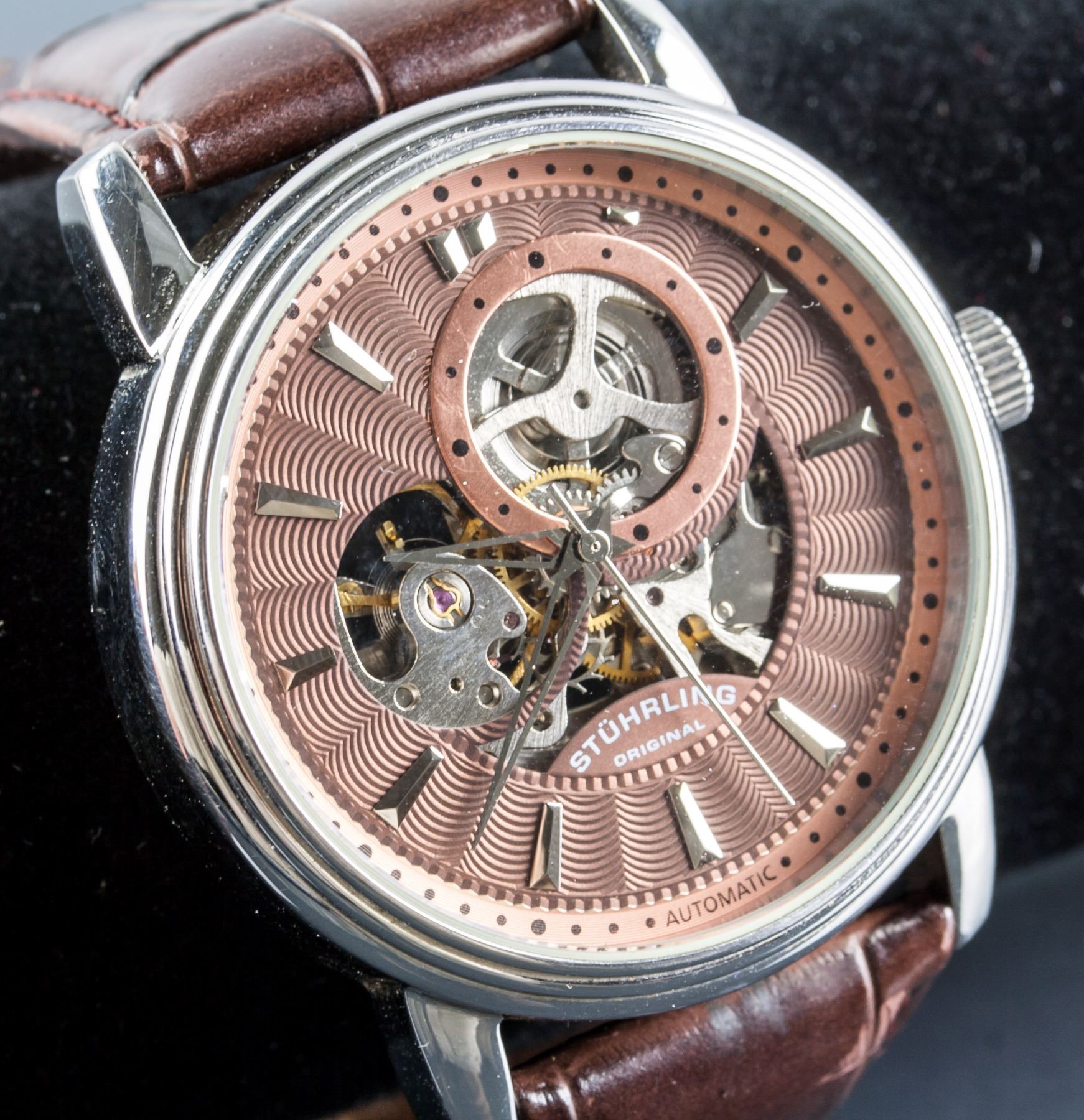 Stuhrling original men's automatic watch; stainless steel, water resistant up to 50 meters; CAL.ST-90050; with bronze colored genuine leather band