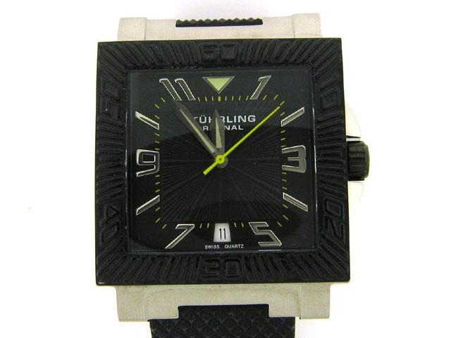 This is a Sturhling watch with the following features: Rubber band and clasp with Sturhling name; All stainless steel; Swiss quartz movement; and Water resistant.