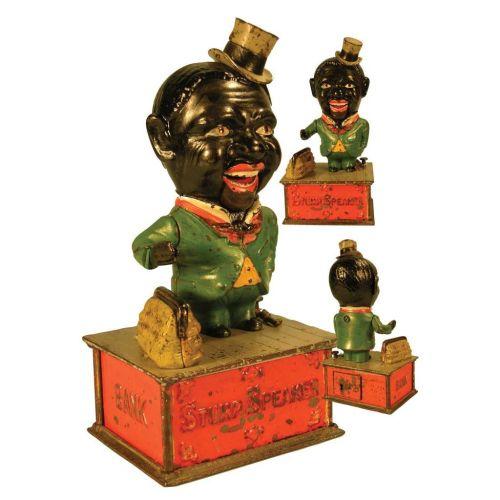Stump Speaker Mechanical Bank, patent date 1886. Most of the original paint intact, complete working condition with key. 5 X 10 X 4 inches.
