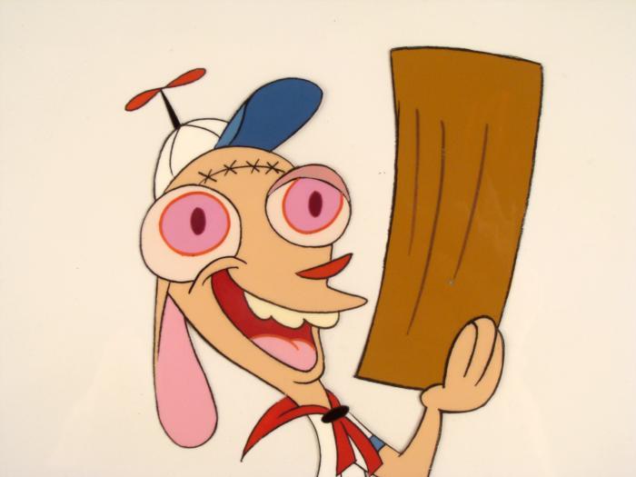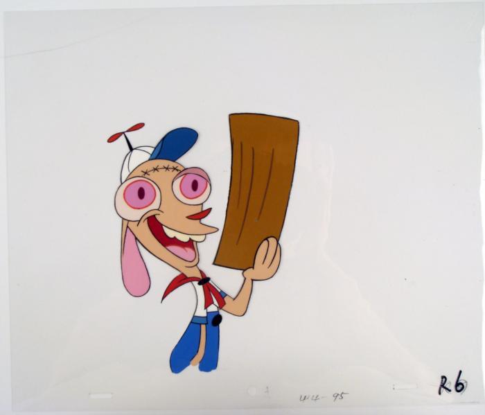 This is an original production animation cel from the Nickelodeon TV show Ren & Stimpy. The show follows two characters - Ren, a crazy Chihuahua - and - Stimpy, an incredibly stupid cat - as they think up to all kinds of hair brained schemes and get themselves into some sticky situations. The Ren and Stimpy Show debuted in August 1991 with a two-part episode, 'Stimpy's Big Day / The Big Shot' and became an instant hit. It was the third Nicktoon ever to be aired on the Network alongside Doug and Rugrats. All Ren can think about is of this piece of wood he's holding, that's if he can think.Original Production Art Cel Overall Size of the Cel: 10 1/2" x 12 1/2" Excellent condition This is an original hand-painted cel set-up used in the production of an episode of "The Ren & Stimpy Show." Each one-of-a-kind set-up represents a slight change in position of the characters. When individually photographed and projected in rapid succession, the images appear to move.