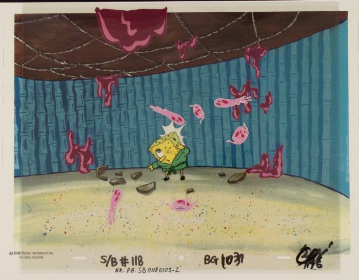 This animation cel and reproduction background are from the Nickelodeon TV show SpongeBob Squarepants. The story takes place under the deep blue sea in Bikini Bottom, where SpongeBob resides. SpongeBob, who is a yellow, porous sponge, is your typical happy-go-lucky character, as he is always cheerful and enjoys making people laugh. Patrick Star, SpongeBob's neighbor who is a starfish, is your average children's show idiot, as he boasts knowing nothing and is often getting himself into ridiculous situations. Between the homes of these two lies the home of the miserable Squidward, a squid, who is known for being grouchy and playing tricks on SpongeBob and Patrick. Both SpongeBob and Squidward work at the Krusty Krab, a fast food business run by the greedy money-loving Mr. Krabs, a crab, the arch rival of the evil, possibly misunderstood, Plankton. Another neighbor, Sandy Cheeks, an athletic squirrel who normally wears an astronaut's space suit, was introduced in "Tea at the Treedome." She spends most of her time inventing and experimenting. A jellyfish stung SpongeBob.Original Printed Background and Animated Cel Overall Size of Background: 11" x 17" Overall Size of the Cel: 10 1/2" x 12 1/2" Very good condition This is an original hand-painted cel set-up used in the production of an episode of "SpongeBob SquarePants." Each one-of-a-kind set-up represents a slight change in position of the characters. When individually photographed and projected in rapid succession, the images appear to move.