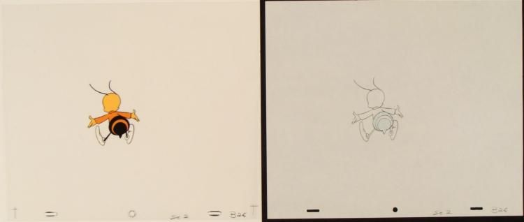 Here, it appears that Buzz looks stunned. This is an original animation cel & drawing from the production of the Cheerios cereal commercial. * Medium: Hand painted acetate cel with drawing * Cel size: 10 1/2 x 12 1/2 inchesDrawing size: 10 1/2 x 12 1/2 inches * Details: Number and peg holes at the bottom edgeCondition: Very goodPencil color: non-photo blue and black