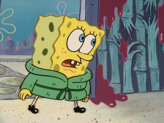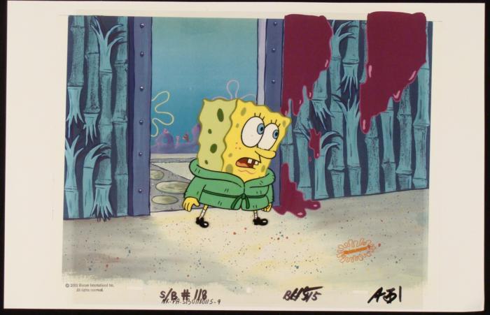 This animation cel and reproduction background are from the Nickelodeon TV show SpongeBob Squarepants. The story takes place under the deep blue sea in Bikini Bottom, where SpongeBob resides. SpongeBob, who is a yellow, porous sponge, is your typical happy-go-lucky character, as he is always cheerful and enjoys making people laugh. Patrick Star, SpongeBob's neighbor who is a starfish, is your average children's show idiot, as he boasts knowing nothing and is often getting himself into ridiculous situations. Between the homes of these two lies the home of the miserable Squidward, a squid, who is known for being grouchy and playing tricks on SpongeBob and Patrick. Both SpongeBob and Squidward work at the Krusty Krab, a fast food business run by the greedy money-loving Mr. Krabs, a crab, the arch rival of the evil, possibly misunderstood, Plankton. Another neighbor, Sandy Cheeks, an athletic squirrel who normally wears an astronaut's space suit, was introduced in "Tea at the Treedome." She spends most of her time inventing and experimenting. SpongeBob is stunned.Original Printed Background and Animated Cel Overall Size of Background: 11" x 17" Overall Size of the Cel: 10 1/2" x 12 1/2" Very good condition This is an original hand-painted cel set-up used in the production of an episode of "SpongeBob SquarePants." Each one-of-a-kind set-up represents a slight change in position of the characters. When individually photographed and projected in rapid succession, the images appear to move.