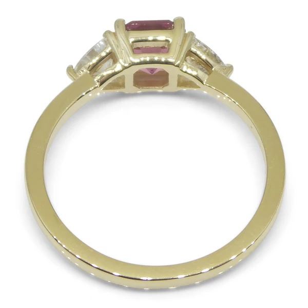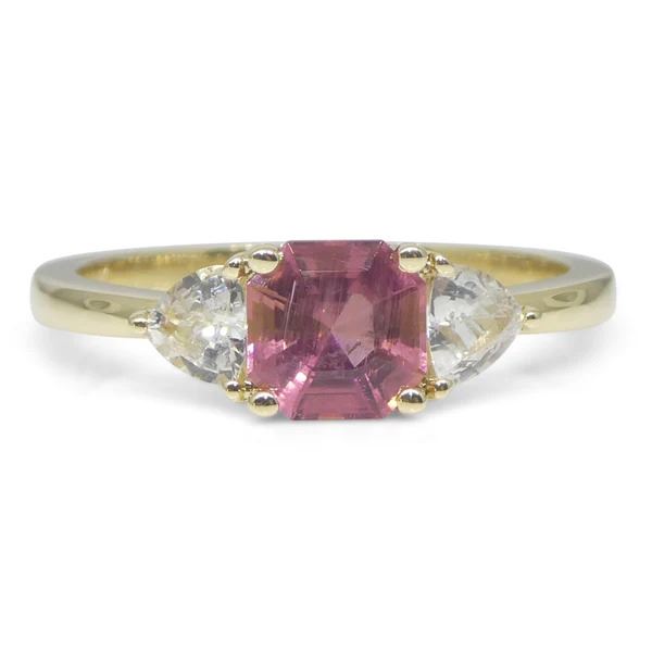 Impressive 0.88 Ct Pink Tourmaline is an asscher cut measuring 5.96 x 5.89 x 3.67 mm. This gorgeous tourmaline is set in 14k Yellow Gold alongside with two White Sapphire stones. This precious ring is currently a size 7, it can be resized for free after purchase. Get ready for the compliments on this one! Treatment: None. Tourmaline Origin: Brazil. Total weight of Sapphire: 0.50 Ct. Total weight of item: 2.57g.