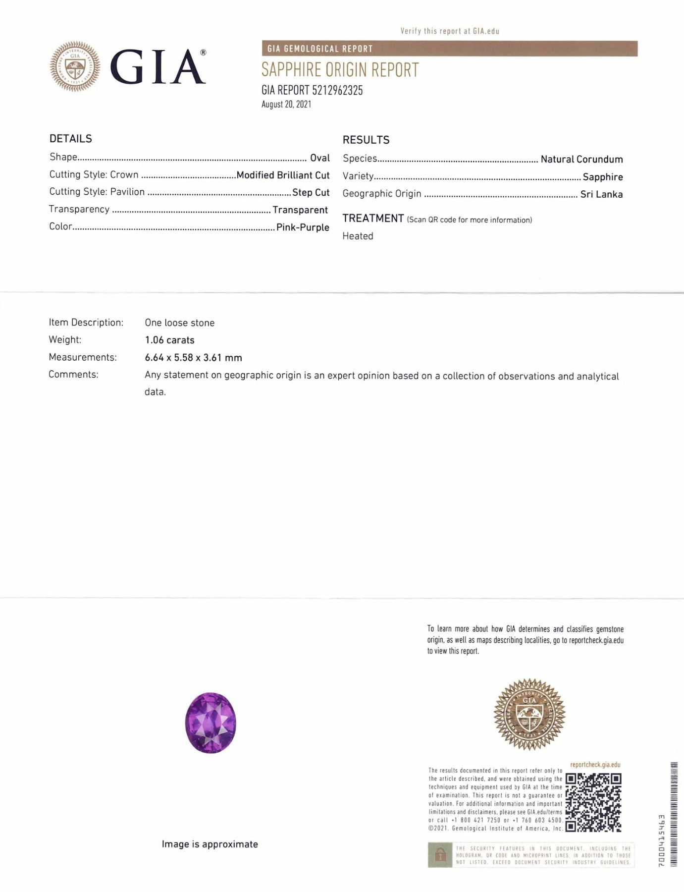 Impressive VVS1 Eye Clean 1.06 Ct Pink-Purple Sapphire is a oval brilliant cut measuring 6.64 x 5.58 x 3.61 mm. This gorgeous sapphire reveals a vivid hue and medium tone. You don't want to miss this one!!! Origin: Sri Lanka. Treatment: Heat only. Please see the certification for additional information.