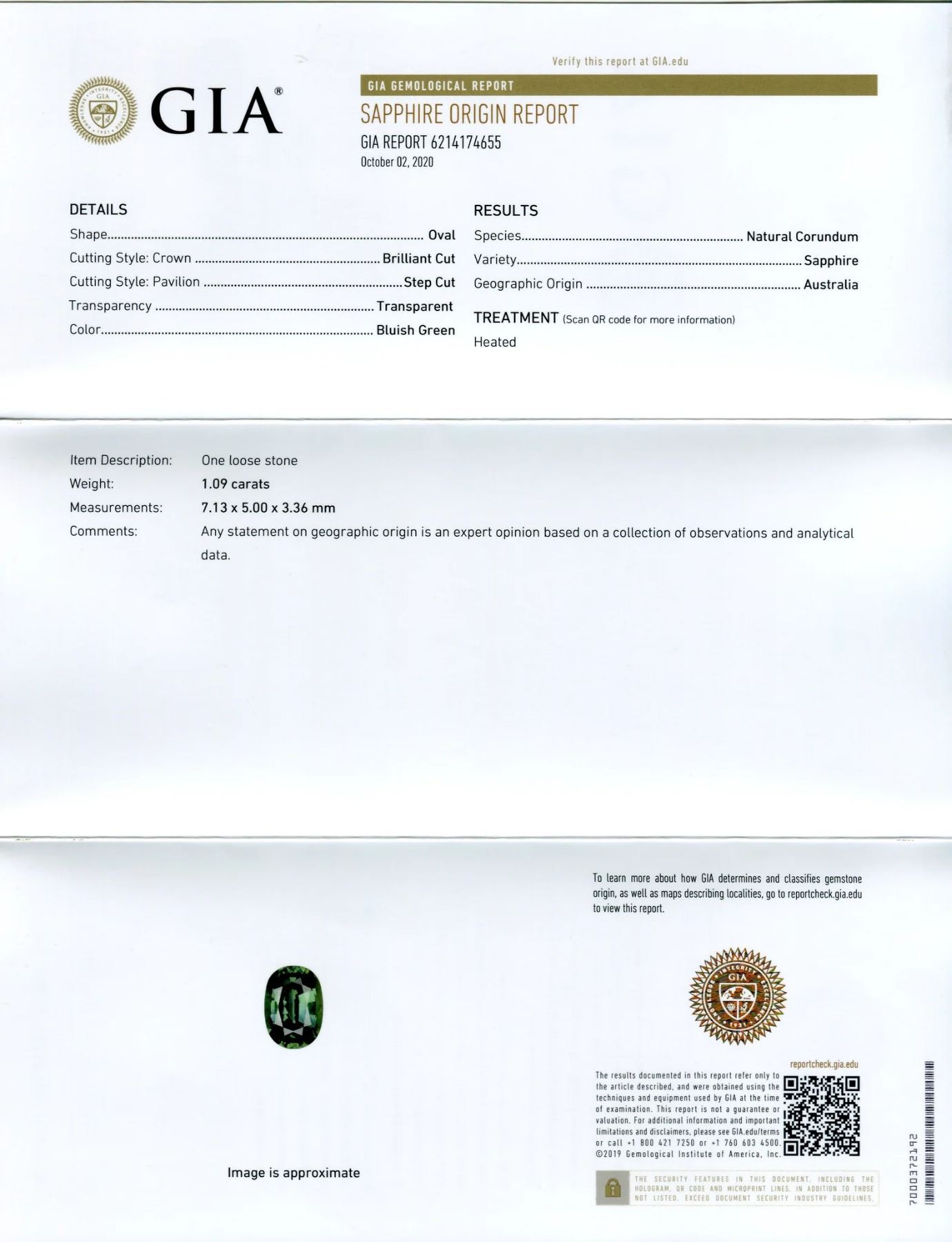 Dazzling 1.09 Ct Teal Green Sapphire measuring 7.13 x 5.00 x 3.36 mm with a brilliant oval cut. Displays a strong tone and hue. Absolutely beautiful! Origin: Australia. Treatment: Heat only. Please see the certification for additional information.