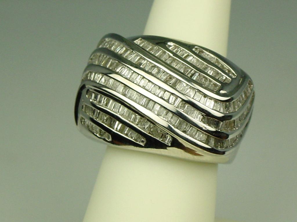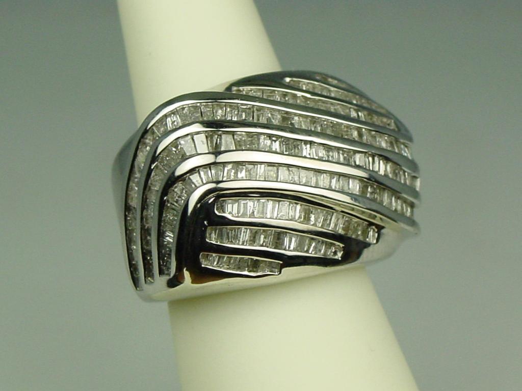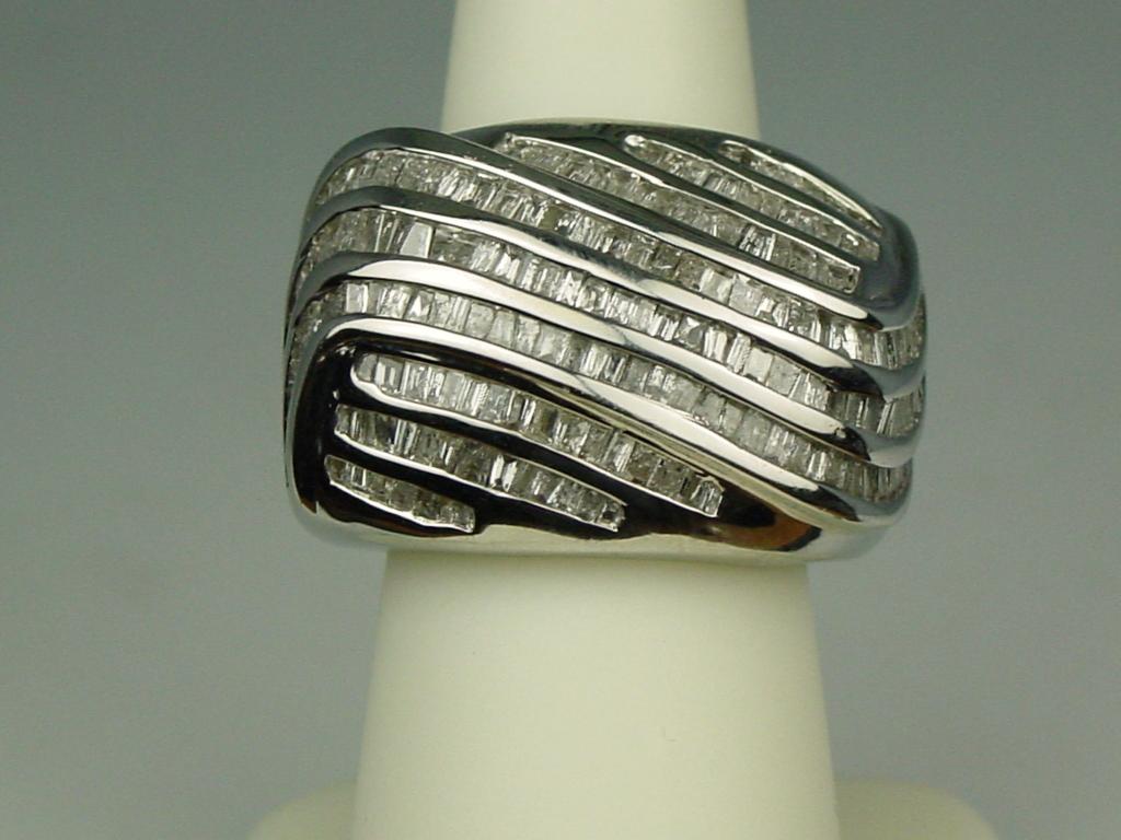 Stunning 10 karat very heavy white gold ladies handmade ring channel set with (too many too count) baguette cut diamonds weighing between 4.00-6.00 carats of H-I colors and I clarity. Retail $3,000-$5,000Estimate $1,000-$1,500 Very labor intensive.