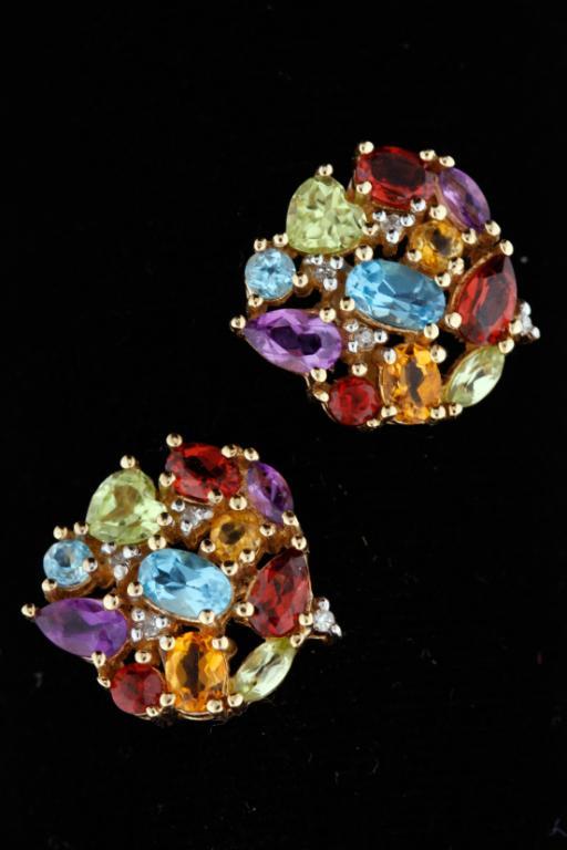 Stunning 10K Yellow Gold Ladies Earrings set with a combination of diamonds, amethyst, citrine, garnets, peridot and topaz weighing approx 4.00 carats. Retail $1,250.00