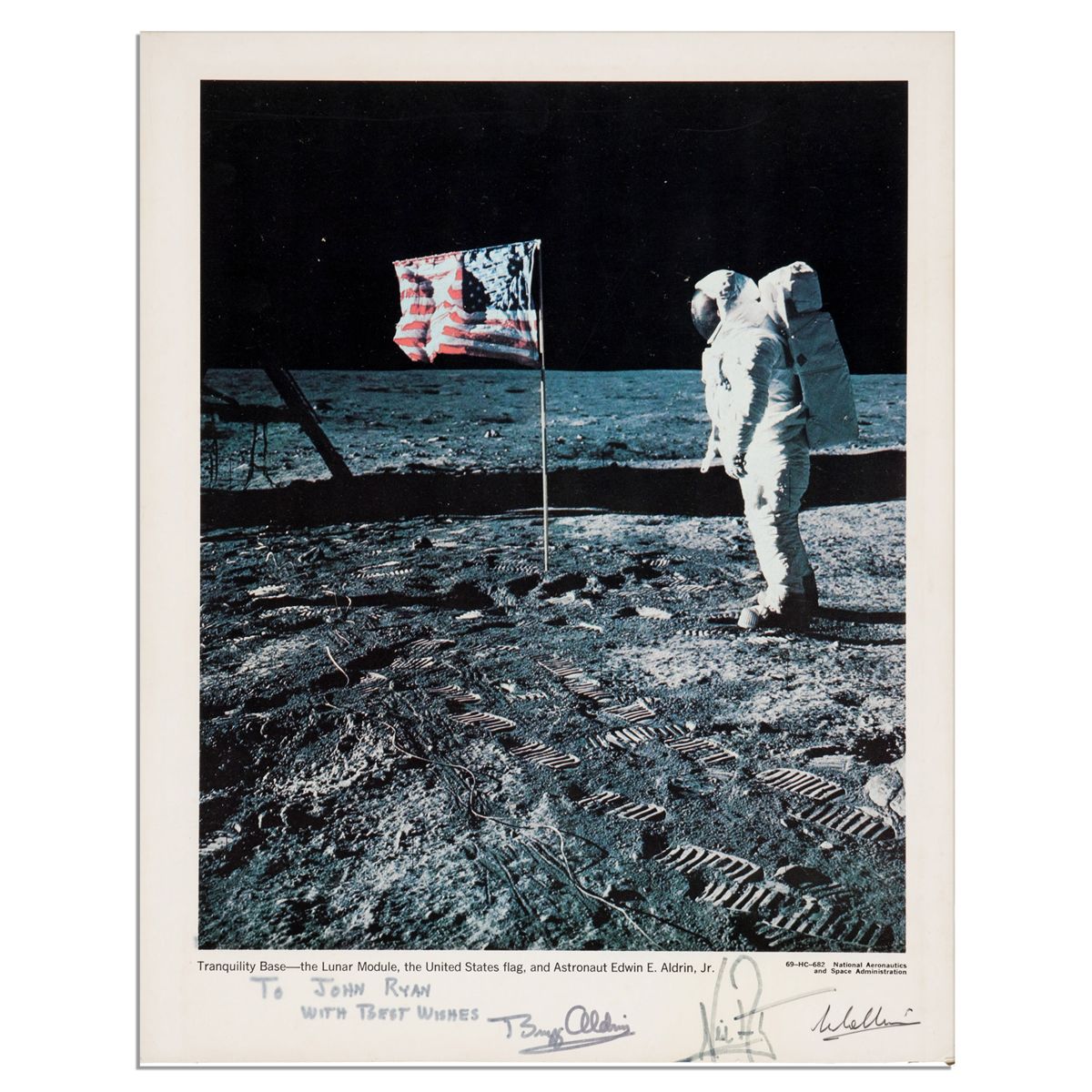 Apollo 11 crew signed 11'' x 14'' photo. The iconic image of Buzz Aldrin on the moon beside the American flag is signed on its border, ''Buzz Aldrin'', ''M Collins'' and ''Neil Armstrong''. A dedication, likely by Aldrin or Armstrong, reads: ''To John Ryan / with Best Wishes'' and could be to John Dale Ryan, Air Force Chief of Staff at the time of Apollo 11. The caption identifies the photo as ''Tranquility Base - the Lunar Module, the United States flag, and Astronaut Edwin E. Aldrin, Jr.'' Mounted to heavy paper board. Faint toning and edge wear, else near fine.