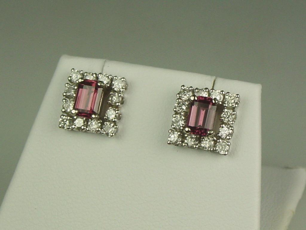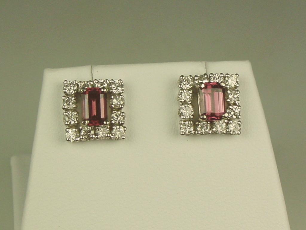 Stunning 14 karat white gold ladies custom made earrings fine set with two matching pink tourmalines weighing approx. 1.50 carats and surrounded by 24 round diamonds weighing approx. 1.20 carats of F-G colors and SIclarity. Retail $2,950.00 Estimate $1,000-$1,500