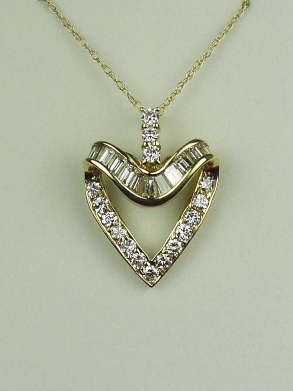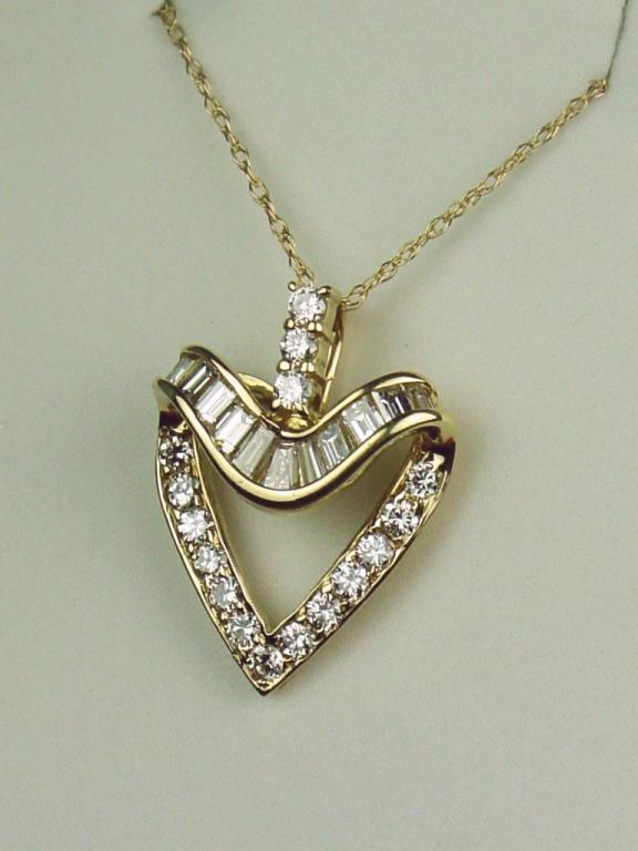 Stunning 14 karat yellow gold ladies custom design heart shape pendant fine set with over 34 round and baguette cut diamonds weighing approx. 1.00 carat of F-G colors and mostly VVS clarity. Retail $3,250.00 Estimate$1,000-$1,500
