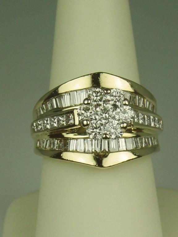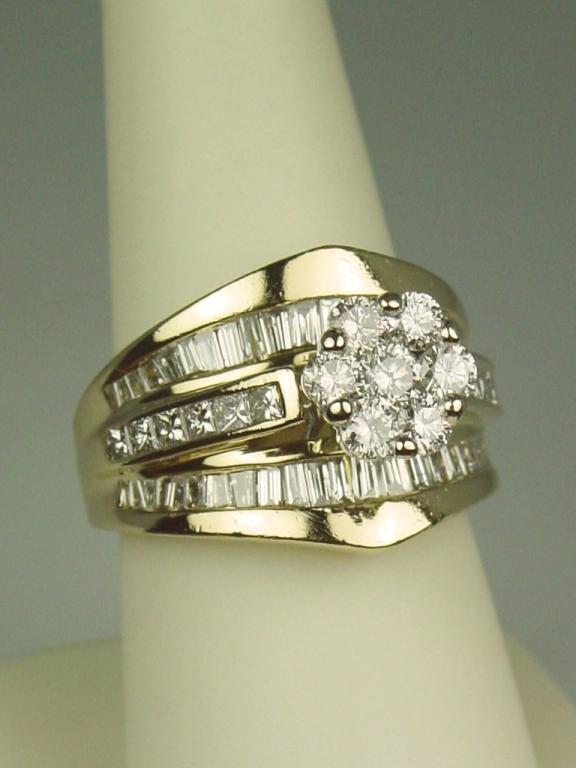 Stunning 14 karat yellow gold ladies custom made ring channel set with a combination of round, princess and baguette cut diamonds weighing approx. 2.50-3.00 carats of G-H colors and mostly VS/SI clarity. Retail$4,950.00 Estimate $1,800-$2,500 and very labor intensive.
