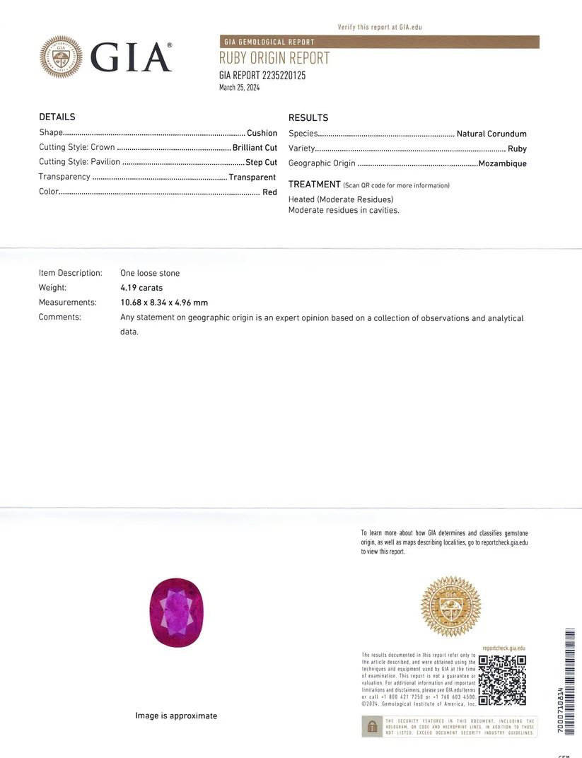 Lovely 4.19 Ct Vivid Red Ruby is a cushion brilliant cut measuring 10.68 x 8.34 x 4.96 mm. Reveals a medium tone with stunning, vivid saturation. This investment-grade ruby is sure to turn heads! Origin: Mozambique. Treatment: Heat only. Please see the certification for additional information.