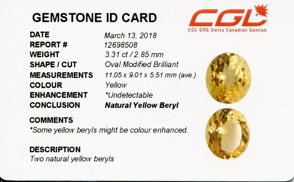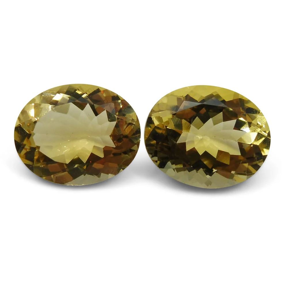 Gorgeous 6.16 Ct (3.31 Ct / 2.85 Ct) Heliodor/ Golden Beryl pair with oval brilliant cuts measuring an average of 11.05 x 9.01 x 5.51 mm. This beautiful pair would be an excellent addition to any jewelry collection!!! Origin: Brazil. Please see the certification for additional information.