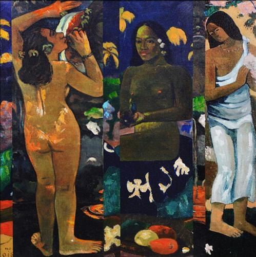 Beautiful hand embellished original color giclee on canvas. Artwork depicts a collection of artwork after Master French Post-Impressionist artist Paul Gauguin. A very finely done original work of art. Size: 40X40 inches.