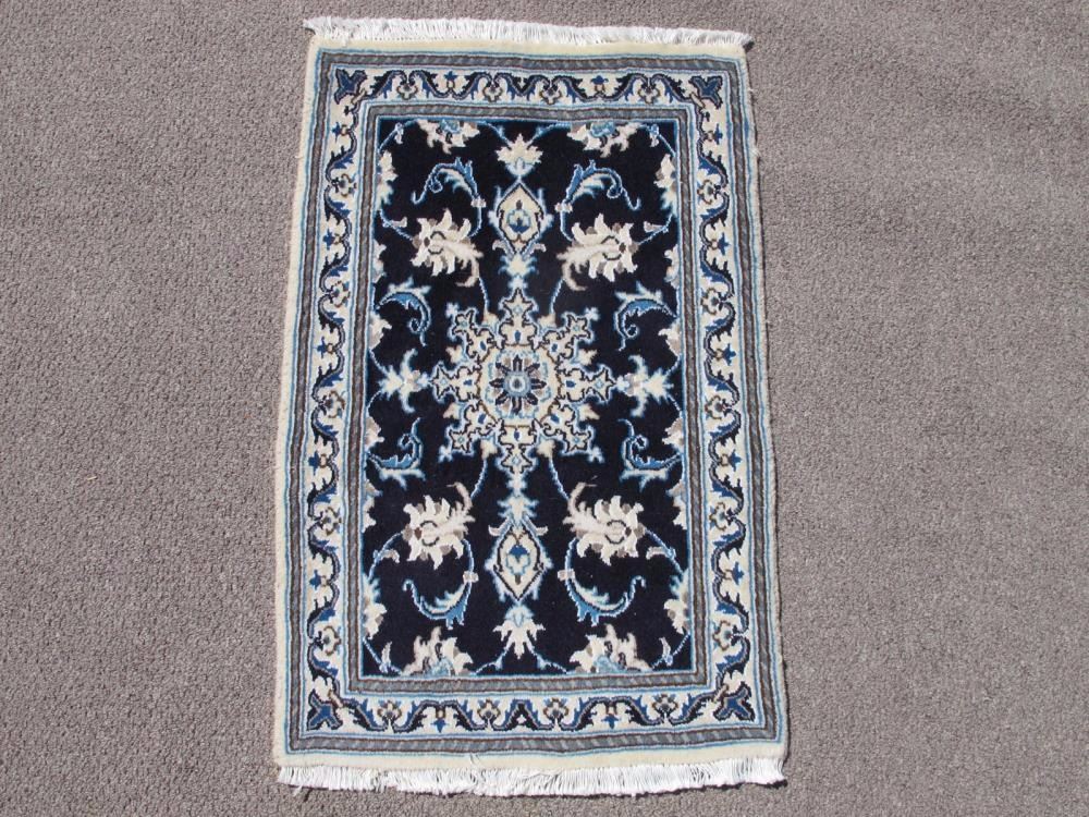 Rug: Handmade Wool and Part Silk Persian Nain; Material: Made of the finest baby lamb's wool and part pure silk pile, all natural vegetable dye ; Size: 2.11 x 1.11 feet; Foundation: Cotton; Design: Persian Nain; Origin: Iran