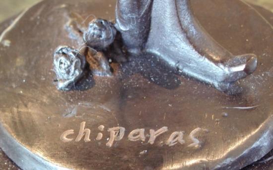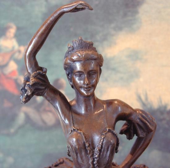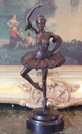 Ballerina Dancer Bronze Sculpture, After Chiparus 13 "H x 5"W x 5"D 12 lbs. This bronze sculpture was produced using the "Lost Wax" casting method. The"Lost Wax" Cast method is the most precise metal casting technique in existence, ensuring exquisite detail of the original host model which is usually sculpted in clay or wax. This "Lost Wax" casting method is an extremely labor intensive and expensive process, but the end results produce a Heirloom Quality Masterpiece!Demetre Chiparus - The first sculptures of Chiparus were created in the realistic style and were exhibited at the Salon of 1914. He employed the combination of bronze and ivory, called chryselephantine, to great effect. Most of his renowned works were made between 1914 and 1933. The first series of sculptures manufactured by Chiparus were the series of the children.The mature style of Chiparus took shape beginning in the 1920s. His sculptures are remarkable for their bright and outstanding decorative effect. Dancers of the Russian Ballet, French theatre, and early motion pictures were among his more notable subjects and were typified by a long, slender, stylized appearance. His work was influenced by an interest in Egypt, after Pharaoh Tutankhamen's tomb was excavated.He worked primarily with the Edmond Etling and Cie Foundry in Paris administrated by Julien Dreyfus. Les Neveux de J. Lehmann was the second foundry who constantly worked with Chiparus and produced the sculptures of his models.Chiparus rarely exhibited at the Salon. In 1923 he showed his "Javelin Thrower" and in 1928 exhibited his "Ta-Keo" dancer. During the period of Nazi persecution and the World War 2 the foundries discontinued production of work by Chiparus. The economic situation of that time was not favorable to the development of decorative arts and circumstances for many sculptors worsened.Since the early 1940s almost no works of Chiparus were sold but the he continued sculpting for his own pleasure, depicting animals in the Art Deco style. At the 1942 Paris Salon, the plaster sculptures "Polar Bear" and "American Bison" were exhibited and in 1943 he showed a marble "Polar Bear" and plaster "Pelican".Collector interest in the work of Chiparus appeared in the 1970s and has flourished since the 1990s.