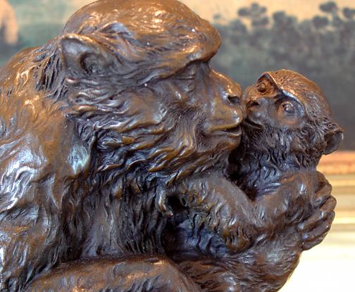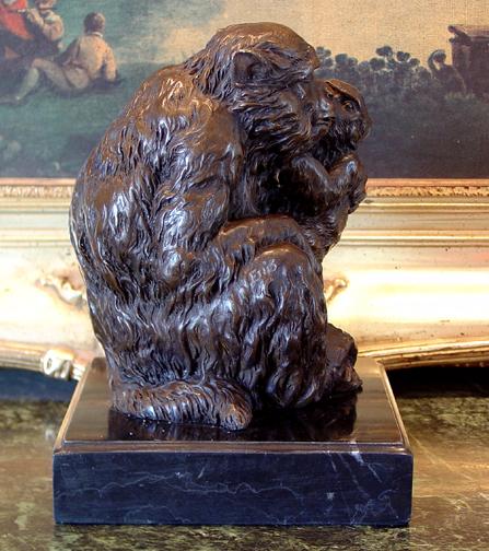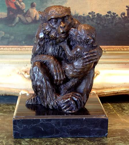 Safari Primate Ape / Monkeys Bronze Sculpture, 9.5"H x 7"D x 7"D16 lbs. This bronze sculpture was produced using the "Lost Wax" casting method. The"Lost Wax" Cast method is the most precise metal casting technique in existence, ensuring exquisite detail of the original host model which is usually sculpted in clay or wax. This "Lost Wax" casting method is an extremely labor intensive and expensive process, but the end results produce a Heirloom Quality Masterpiece!