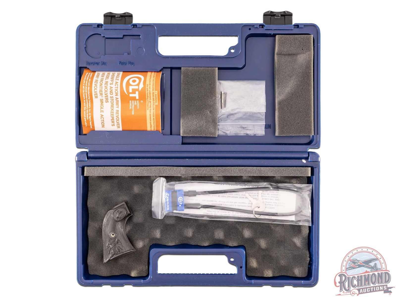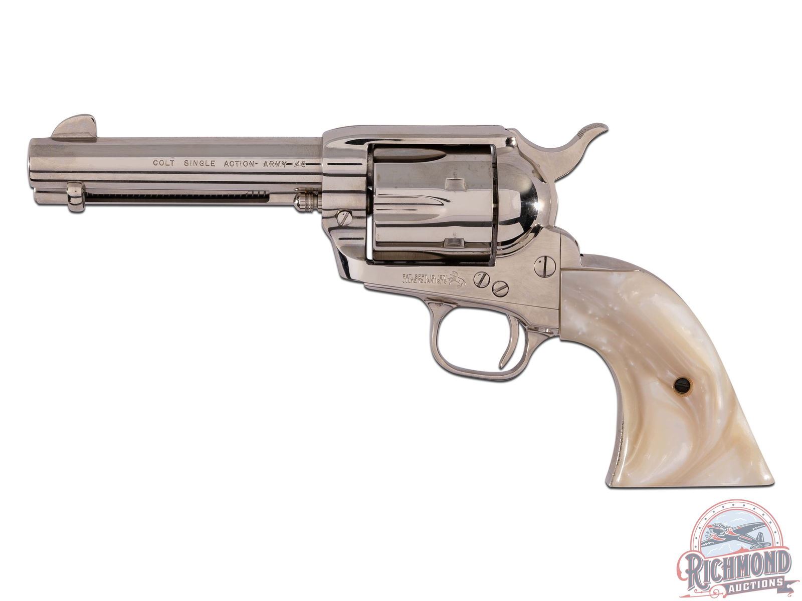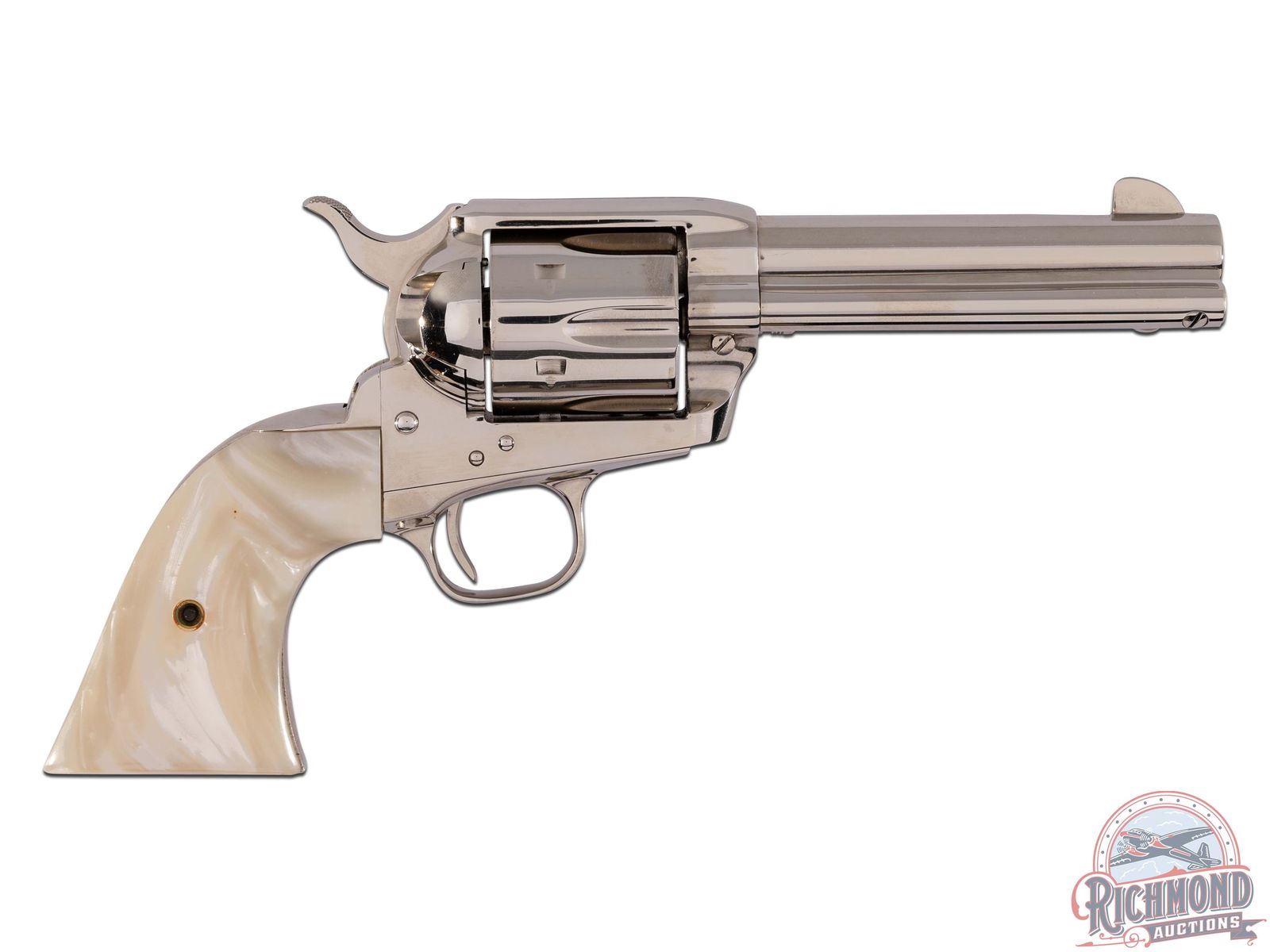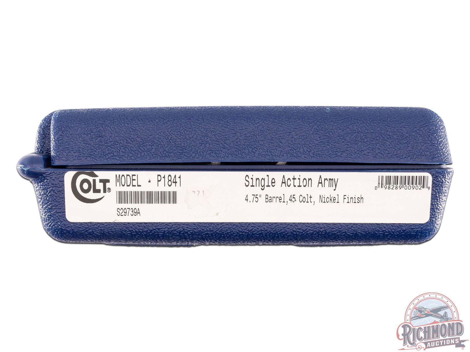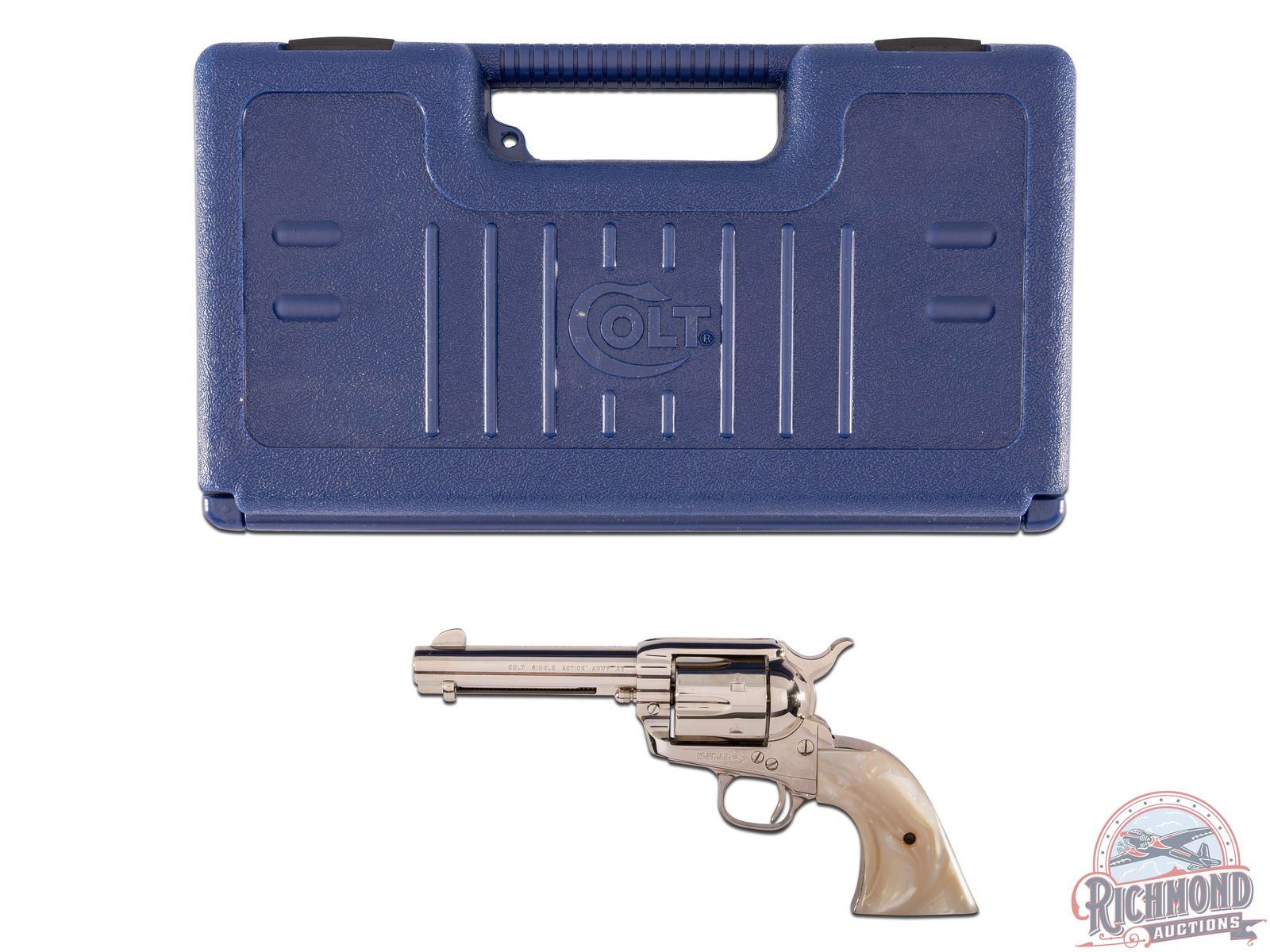 Manufactured in 2000. This fourth generation SAA features a 4-3/4" barrel rear integrated notch sight and blade front sight. Six round fluted cylinder chambered for the popular SASS 45 Colt round. Nickel plated finish. Fitted with aftermarket pearl acrylic grips but does include the original Colt factory black checkered synthetic grips. Comes in the original factory hardcase with cable lock and factory paperwork. CALIBER: 45 COLT. S/N: S29739A. FFL STATUS: Modern.