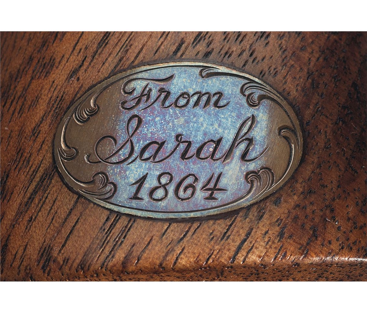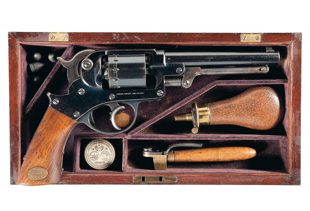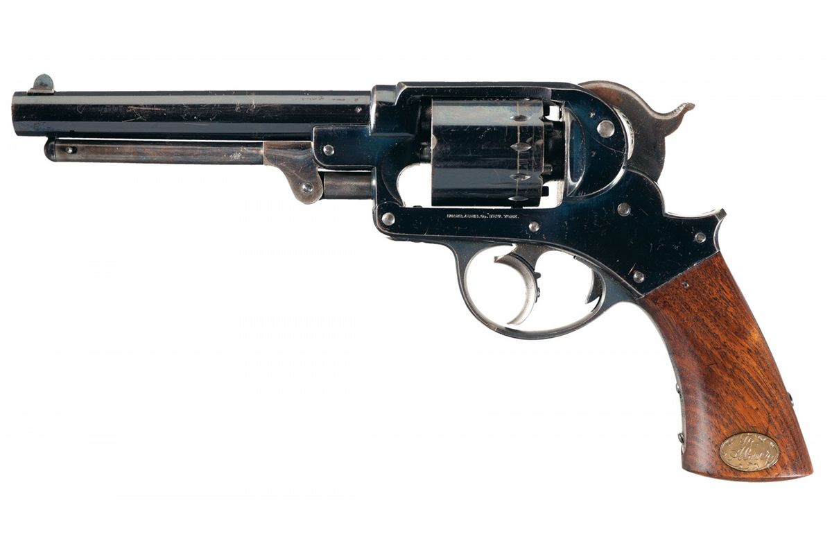 This is a magnificent example and unquestionably one of the finest double action .44 caliber revolvers manufactured by the Starr Arms Co., of New York, New York, c.1863. The revolver has the Starr high polish blue finish with color casehardened loading lever, hammer and trigger and one-piece oil finished walnut grip.The left side of the frame is roll-stamped: "STARR ARMS Co. NEW YORK" below the cylinder. The opposite side of the frame is roll-stamped: "STARR'S PATENT JAN. 15, 1856.". Single letter Ordnance sub-inspection marks are stamped on most components. The serial number, "20059" is stamped on the side of the cylinder. An oval brass plate inlaid in the lower left side of the grip is inscribed: "To/Abner". An identical brass plate on the lower right side of the grip is inscribed: "From/Sarah/1864". The edges of both plates are engraved with open scrollwork. The plates are located in the same position on the grip as the Ordnance final inspector's and sub-inspector marks on U.S. contract arms. The revolver is accompanied by what appears to be an original Kidder mahogany case which lacks the patent dates but features the reinforced brass corners with five compartments lined with purple velvet. The case contains a small powder flask with fixed charger and leather covered body marked: "W.BARTRAM" on the top, tin of 100 Goldmark percussion caps manufactured by the Winchester Repeating Arms Co., unmarked, single cavity bullet mold with wooden handle and iron spruce cutter and several .44 caliber conical lead bullets. This revolver was formerly in the Robert Howard collection.